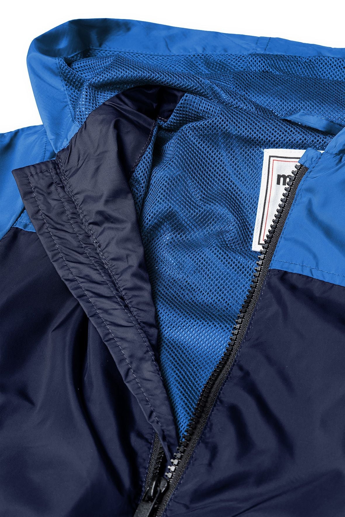 A boys windbreaker coat designed for everyday use as a lightweight outer layer. the cobalt blue coat features a hood for additional weather protection and long sleeves finished with elasticated cuffs to ensure a secure fit. it includes a central front zip in a contrasting colour for easy dressing. the design incorporates a cut and sew body panel in a contrasting shade, adding distinct visual appeal. along each sleeve, a printed tape detail with slogan branding contributes contemporary styling. the breathable fabric supports comfortable wear during seasonal changes. coat is suited for casual outdoor wear, combining functional elements with modern construction.