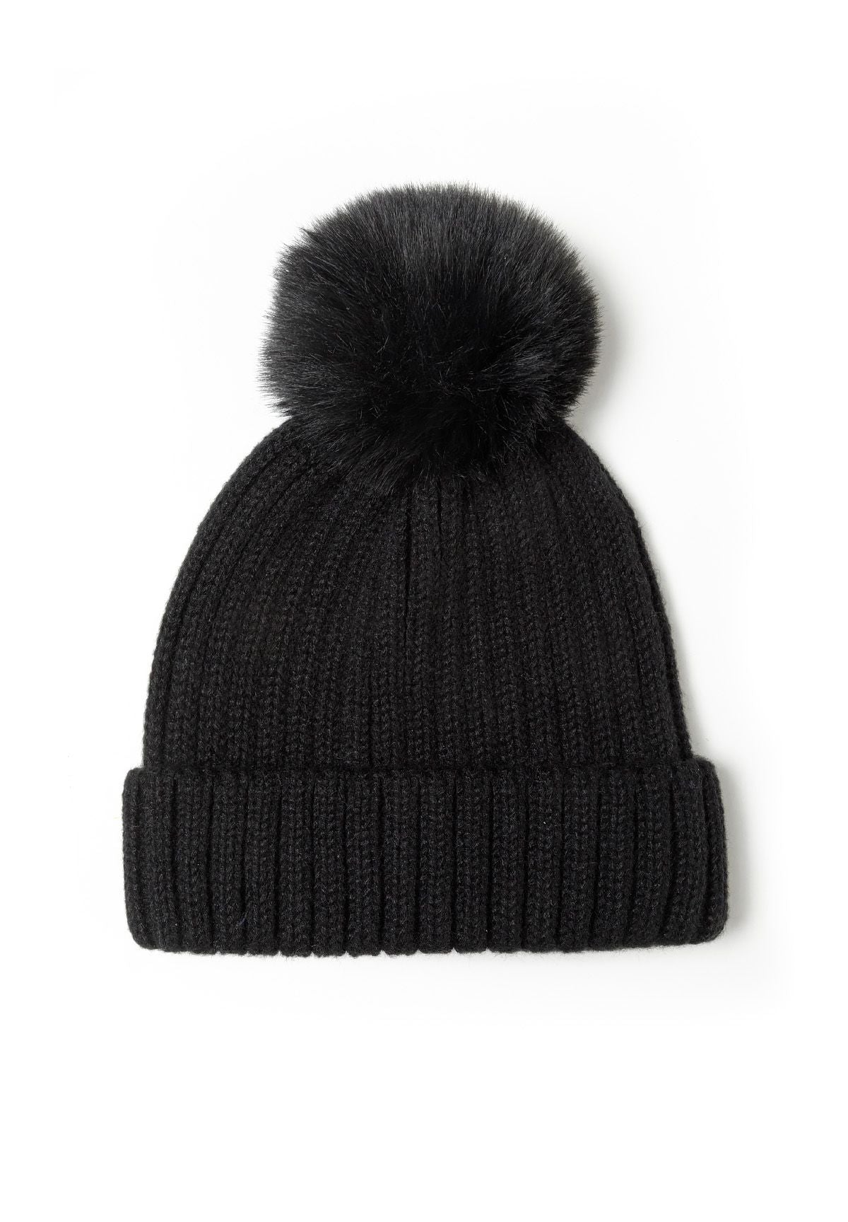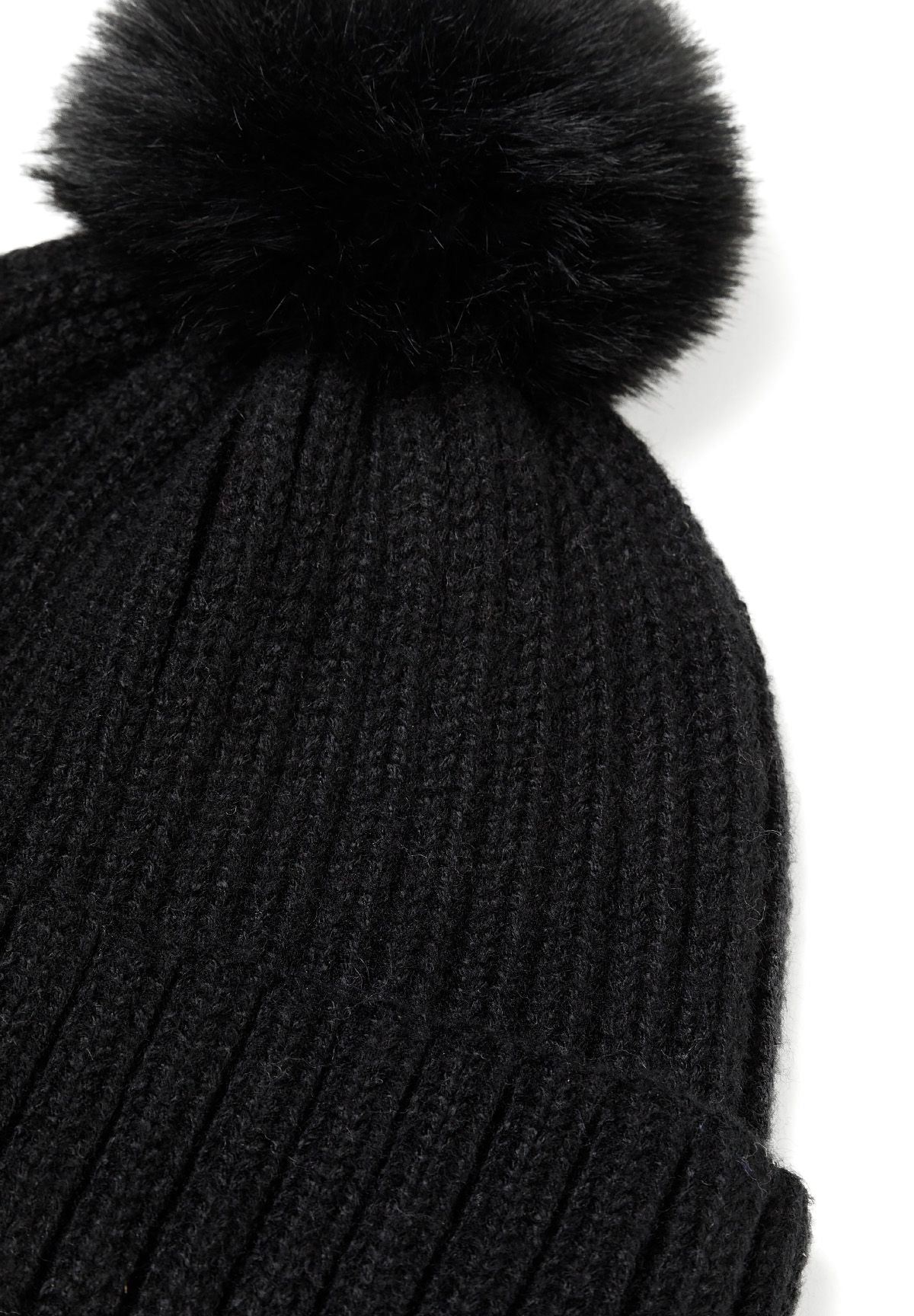 Damen 2-teiliges gestricktes Schlauchschal- und Mützen-Set mit Kunstfellbommel schwarz Einheitsgröße