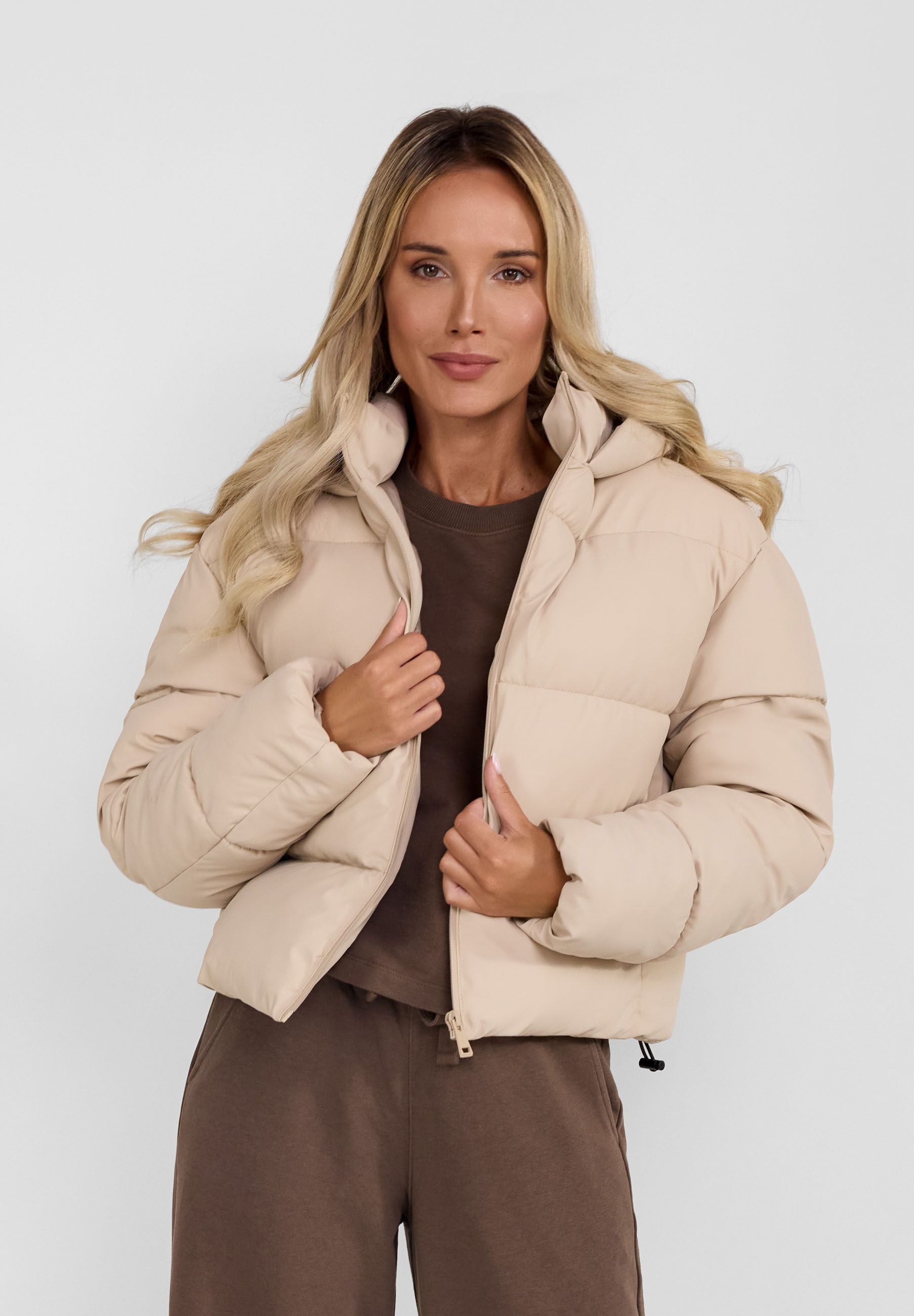 Für Damen entworfen, vereint die kurze Steppjacke ein leichtes, wasserabweisendes Gewebe, das Regen und schmelzenden Schnee wirkungsvoll abweist und dafür sorgt, dass Sie bei nassem Wetter trocken bleiben. Das graue Kleidungsstück verfügt über einen sicheren, durchgehenden Frontreißverschluss, ergänzt durch einen hohen Stehkragen und eine feste Kapuze, die beide wichtigen Schutz vor kaltem Wind bieten. Im Inneren ist die Jacke vollständig gefüttert und isoliert, um an kühlen Tagen Wärme zu bewahren. Der leicht elastische Saum ist mit einem verstellbaren Kordelzug ausgestattet, der eine maßgeschneiderte Passform ermöglicht und Komfort sowie Bewegungsfreiheit verbessert. Praktische Funktionalität trifft auf verlässliche Wärmedämmung in dieser Alltagsjacke für kühlere Temperaturen.