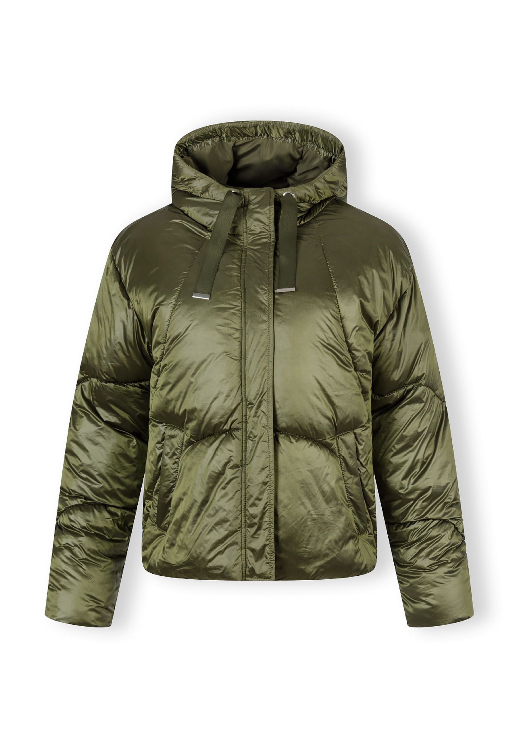 Speziell für Frauen entworfen, bietet die kurze gesteppte Jacke wirksame Wärmeisolierung und Schutz vor Wind bei kühlerem Wetter. Das olivfarbene Außenmaterial zeichnet sich durch eine glänzende Oberfläche aus, die einen modernen, gepflegten Look verleiht, ergänzt durch elegant geschwungene Steppnähte am Körper. Ein durchgehender Reißverschluss in der Mitte wird durch eine Druckknopf-Sturmklappe gesichert, die den Windschutz verstärkt. Die Jacke verfügt über eine feste Kapuze mit verstellbarem Kordelzug und metallischen Endstücken, die eine individuelle Passform gewährleisten. Funktionale Elemente sind zwei schräg angesetzte Seitentaschen, die zum Wärmen der Hände oder zum Verstauen kleiner persönlicher Gegenstände dienen. Die Innenfüllung und das Futter sorgen gemeinsam für Wärme, wodurch die Jacke sich für den täglichen Gebrauch im Herbst und Winter eignet und Stil mit praktischem Wetterschutz verbindet.