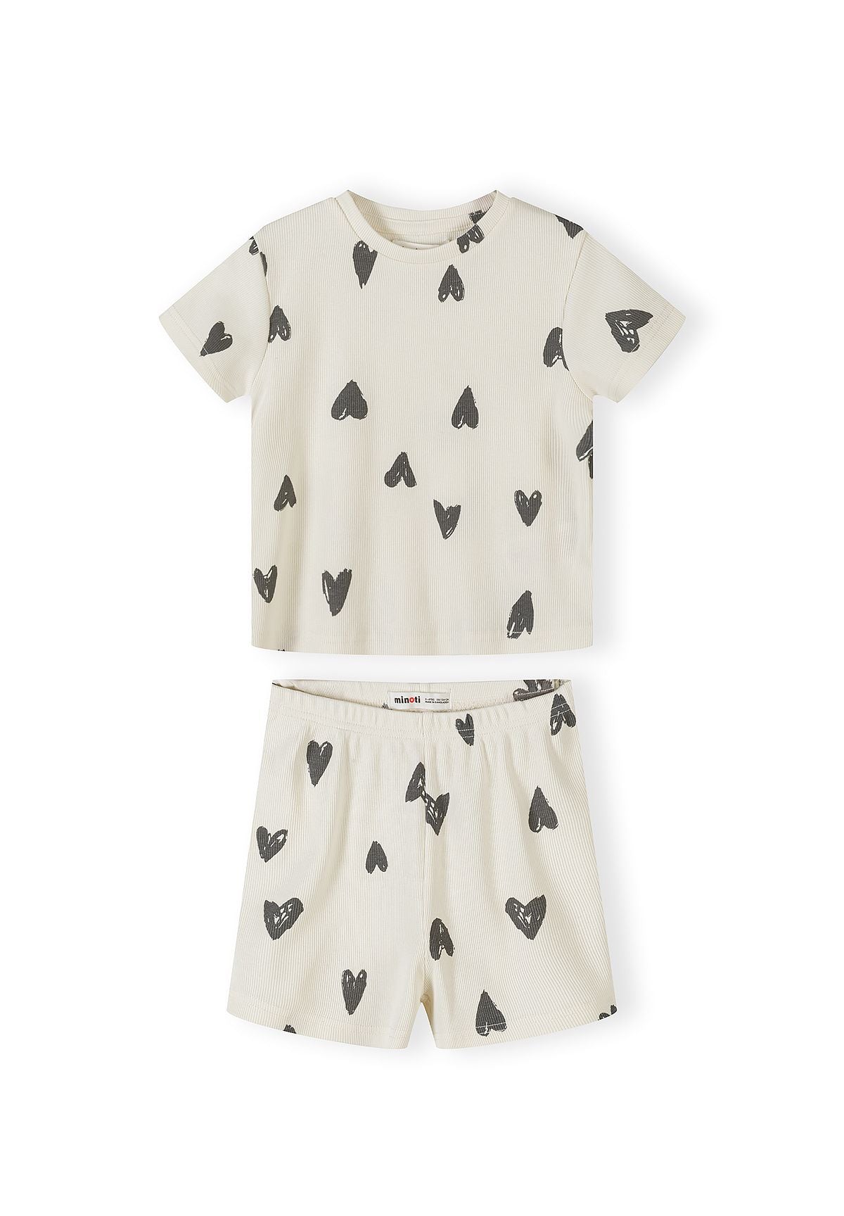 Three delightful ribbed pyjama sets featuring charming hand-drawn hearts on soft cream and grey fabrics. Each set includes a comfortable short-sleeved top with crew neck and matching elasticated shorts, perfect for warm nights and cosy mornings. Quality cotton construction ensures lasting comfort through countless adventures and peaceful sleeps.