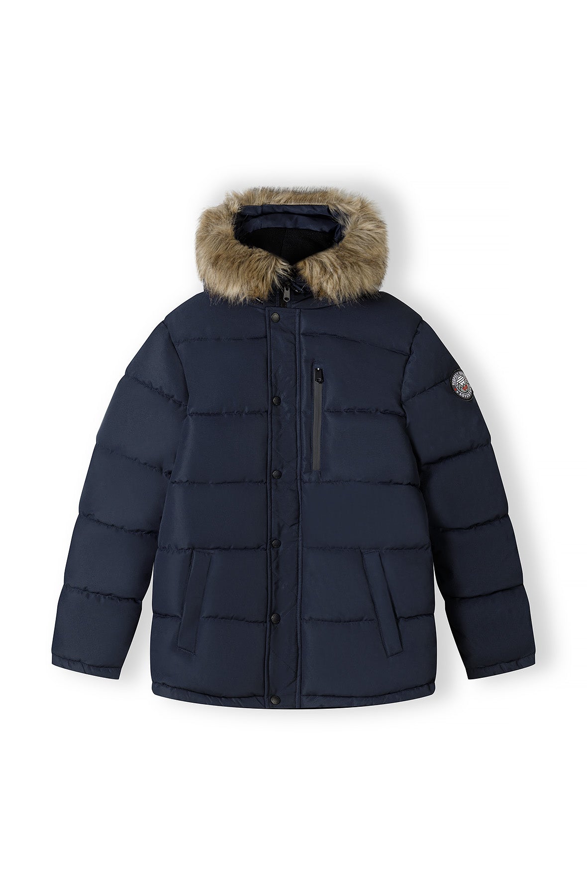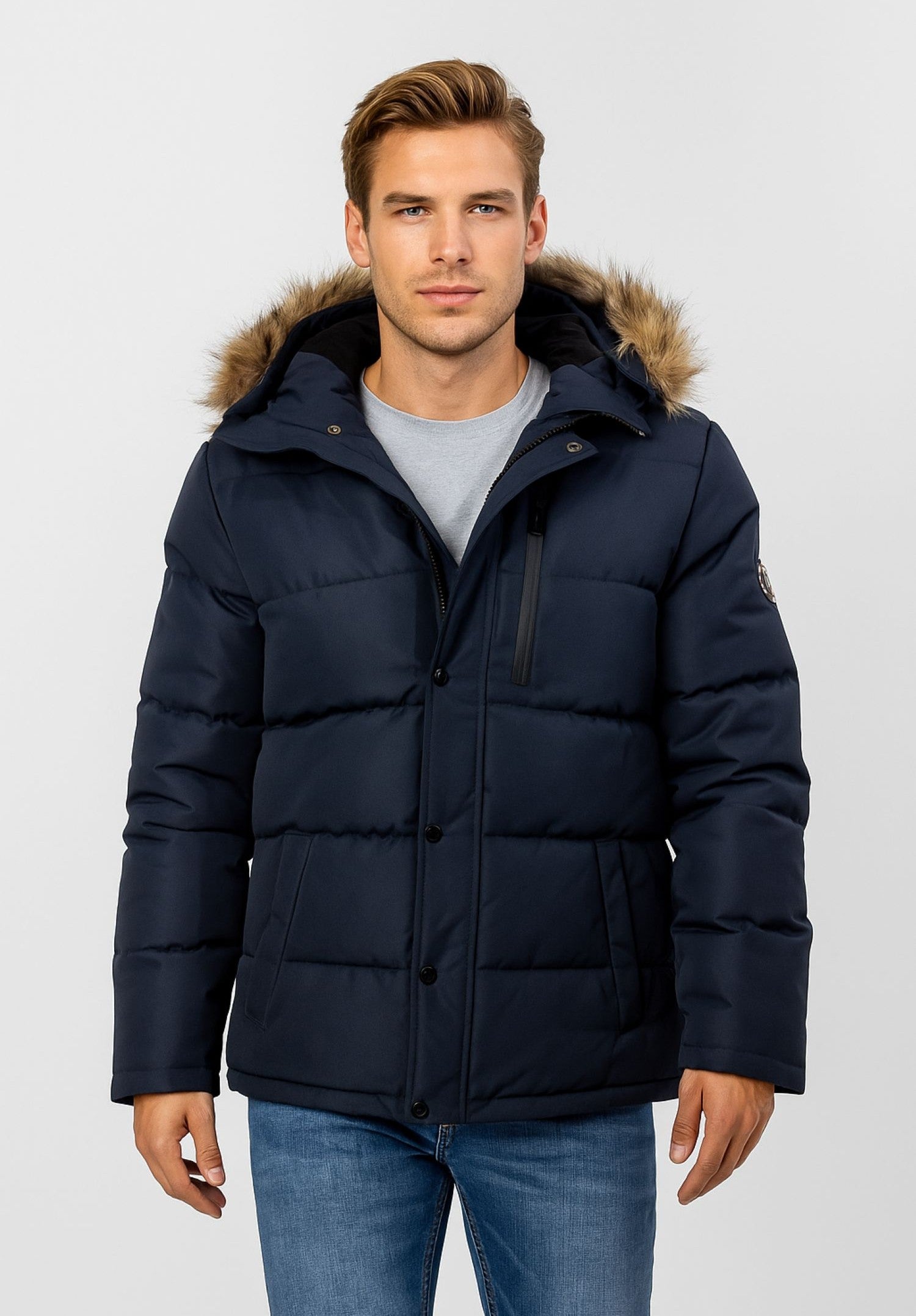 Herren-Winterjacke, entworfen für kalte Wetterbedingungen, mit gesteppter Konstruktion und dicker Isolierung, die vor Wind und niedrigen Temperaturen schützt. Die Jacke verfügt über eine abnehmbare Kapuze, die mit weichem Kunstfell besetzt ist und sowohl Wärme als auch Optik verbessert. Sie bietet einen hohen Stehkragen und einen winddichten Reißverschluss mit Druckknopfleiste, um die Wärme bei kaltem Wetter effektiv zu speichern. Das Design umfasst zwei seitliche Taschen mit Druckknöpfen und eine Brusttasche mit Reißverschluss, die sicheren Stauraum für wichtige Dinge bieten. In klassischem Marineblau gehalten, lässt sich die Jacke gut mit Freizeitkleidung kombinieren. Das strapazierfähige Kleidungsstück bietet zuverlässigen Schutz und zeitlosen Stil für die Wintergarderobe von Herren.