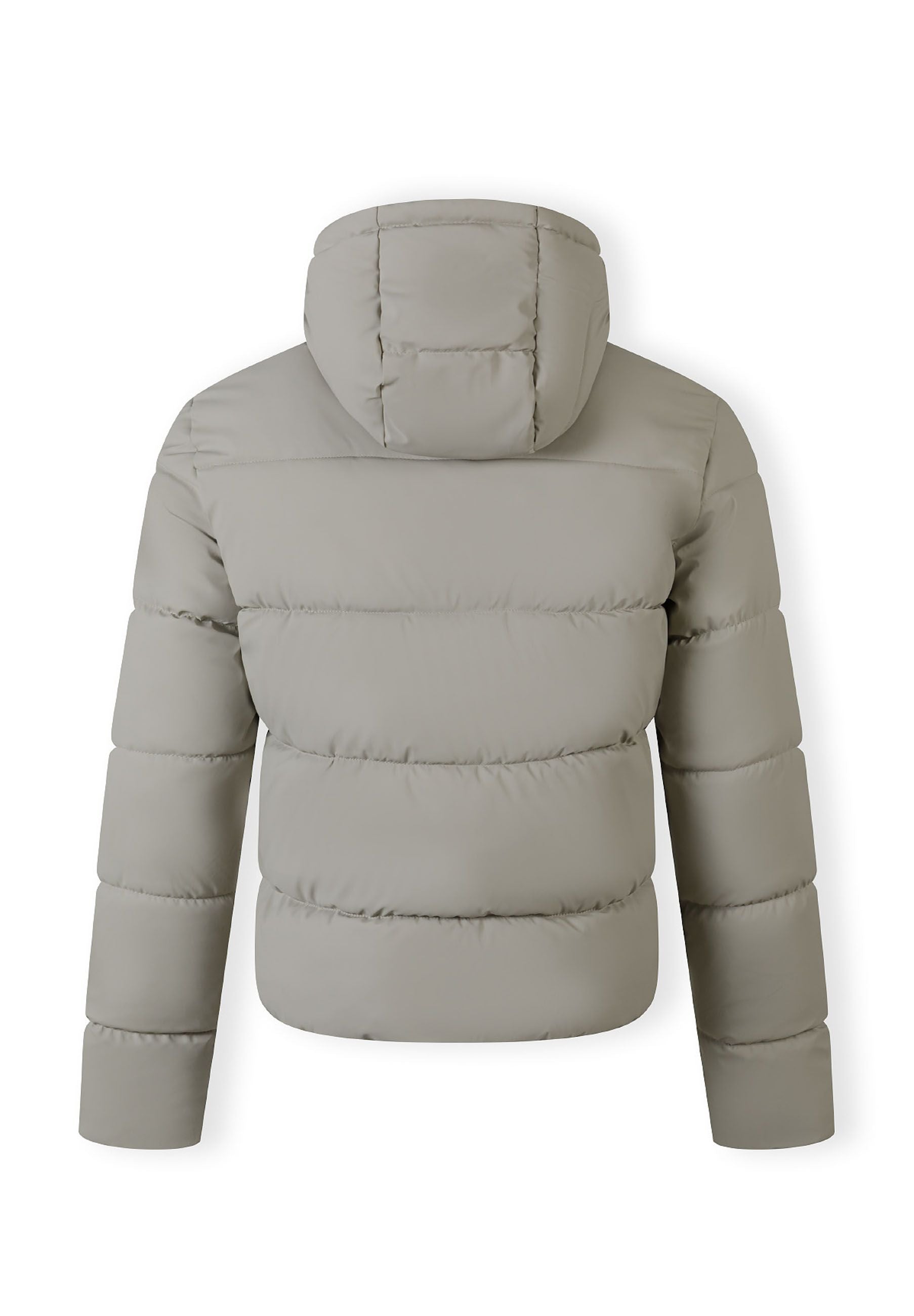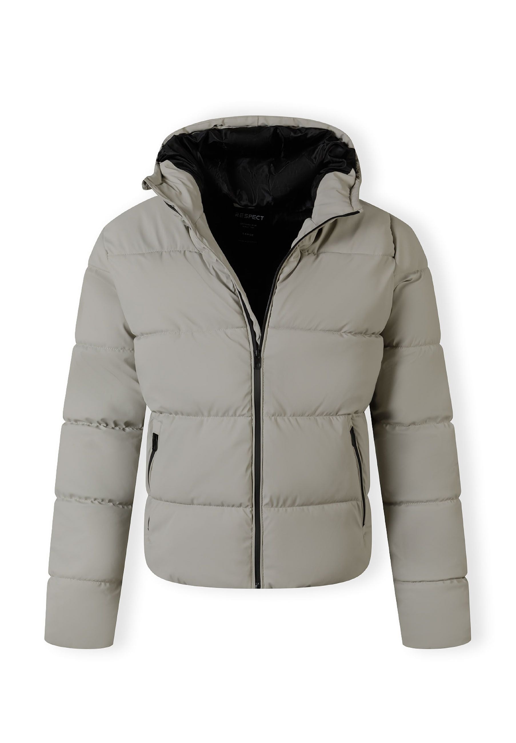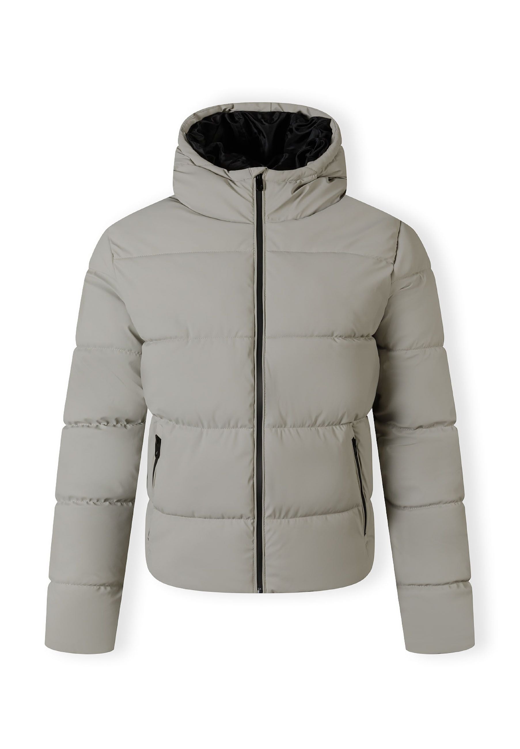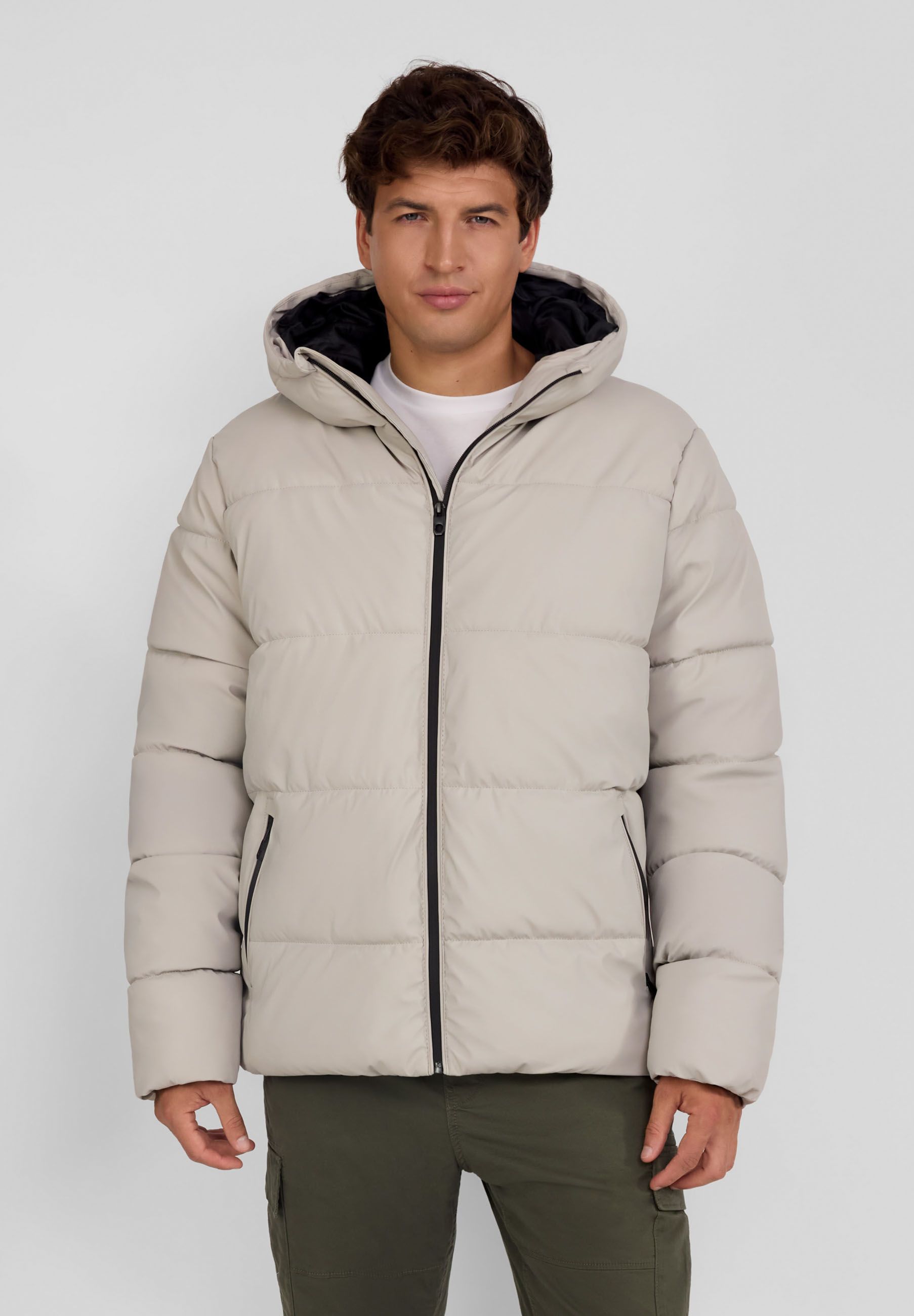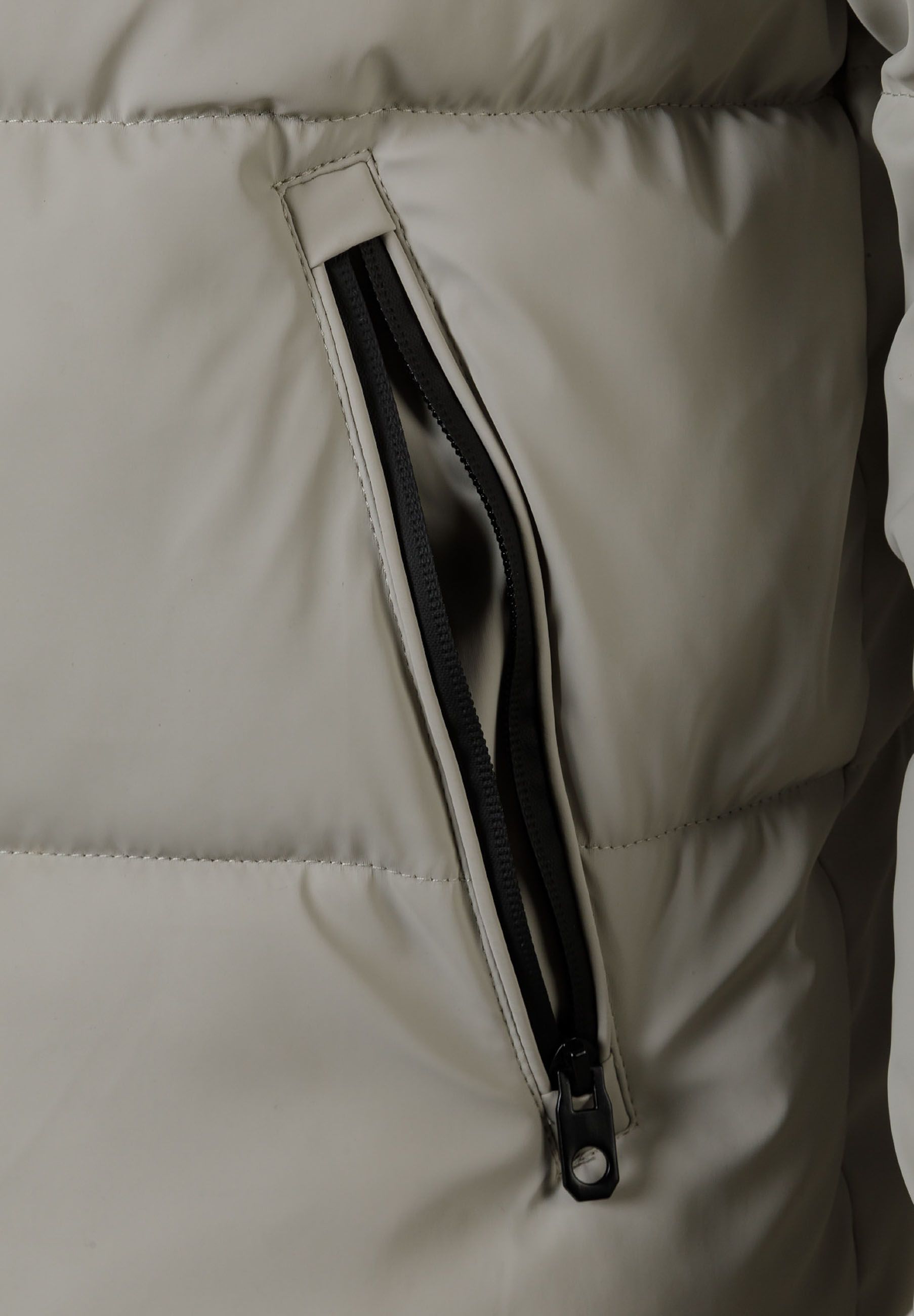 Eine Herrenaußenjacke für die Übergangszeit, gefertigt aus synthetischem PU-Stoff in grauer Farbe. Sie verfügt über eine wattierte Struktur mit glatter Oberfläche, die das Abperlen von Wasser unterstützt, und einen sportlichen Schnitt, der durch einen hohen Kragen zum Schutz vor Wind ergänzt wird. Die Jacke hat eine angenähte Kapuze für zusätzlichen Schutz, einen durchgehenden Frontreißverschluss und zwei seitliche Reißverschlusstaschen für sichere Aufbewahrung. Elastische Bündchen und Saum sorgen für eine eng anliegende, verstellbare Passform, während das Innenfutter aus weichem Material für erhöhten Tragekomfort sorgt. Weitere Details sind ein tonales Innenfutter und ein dezentes Abzeichen am linken Ärmel, wodurch das Kleidungsstück für Herbst- und Wintertragezeiten geeignet ist.