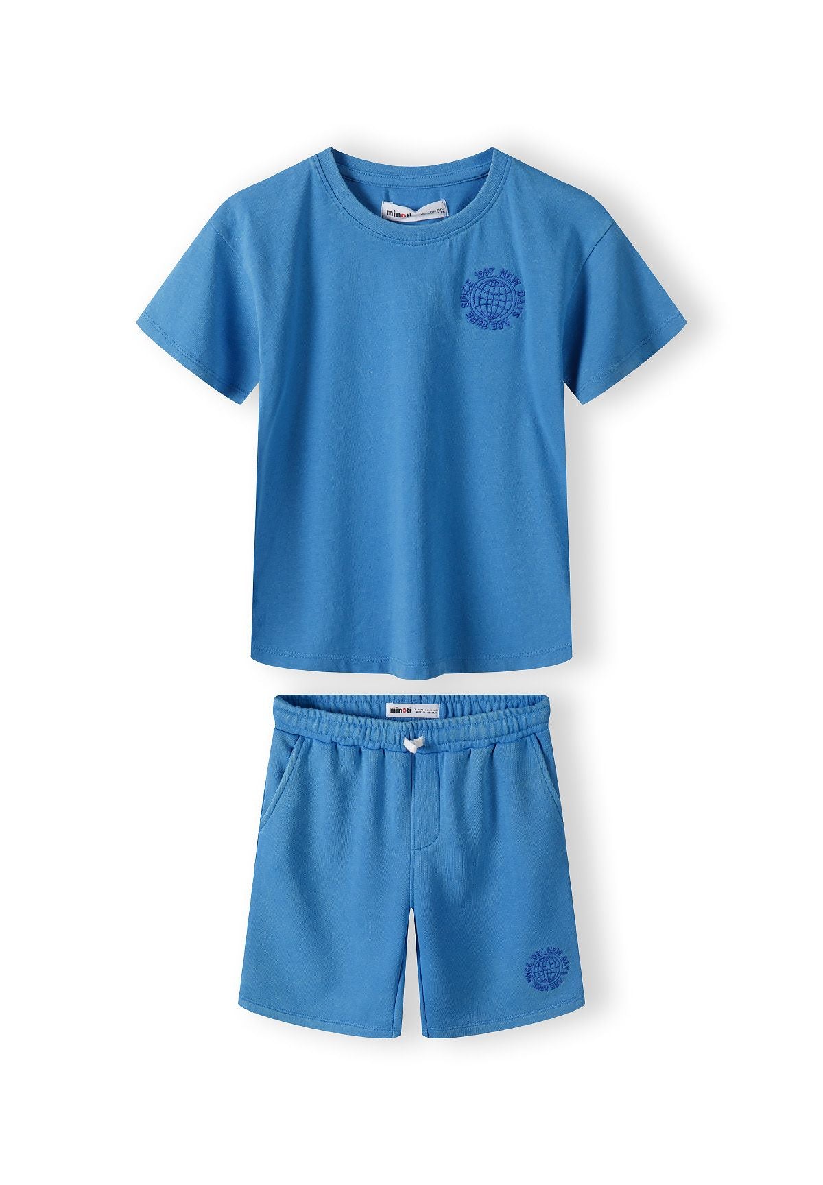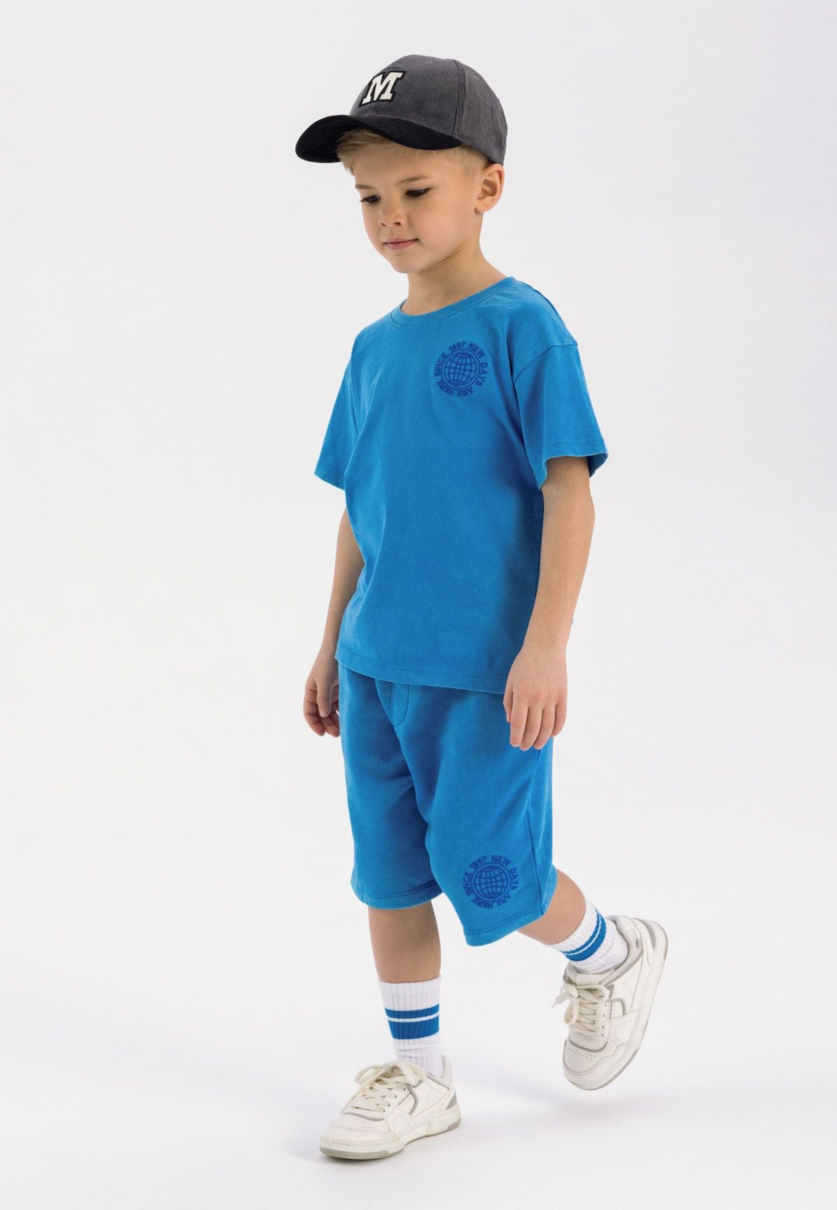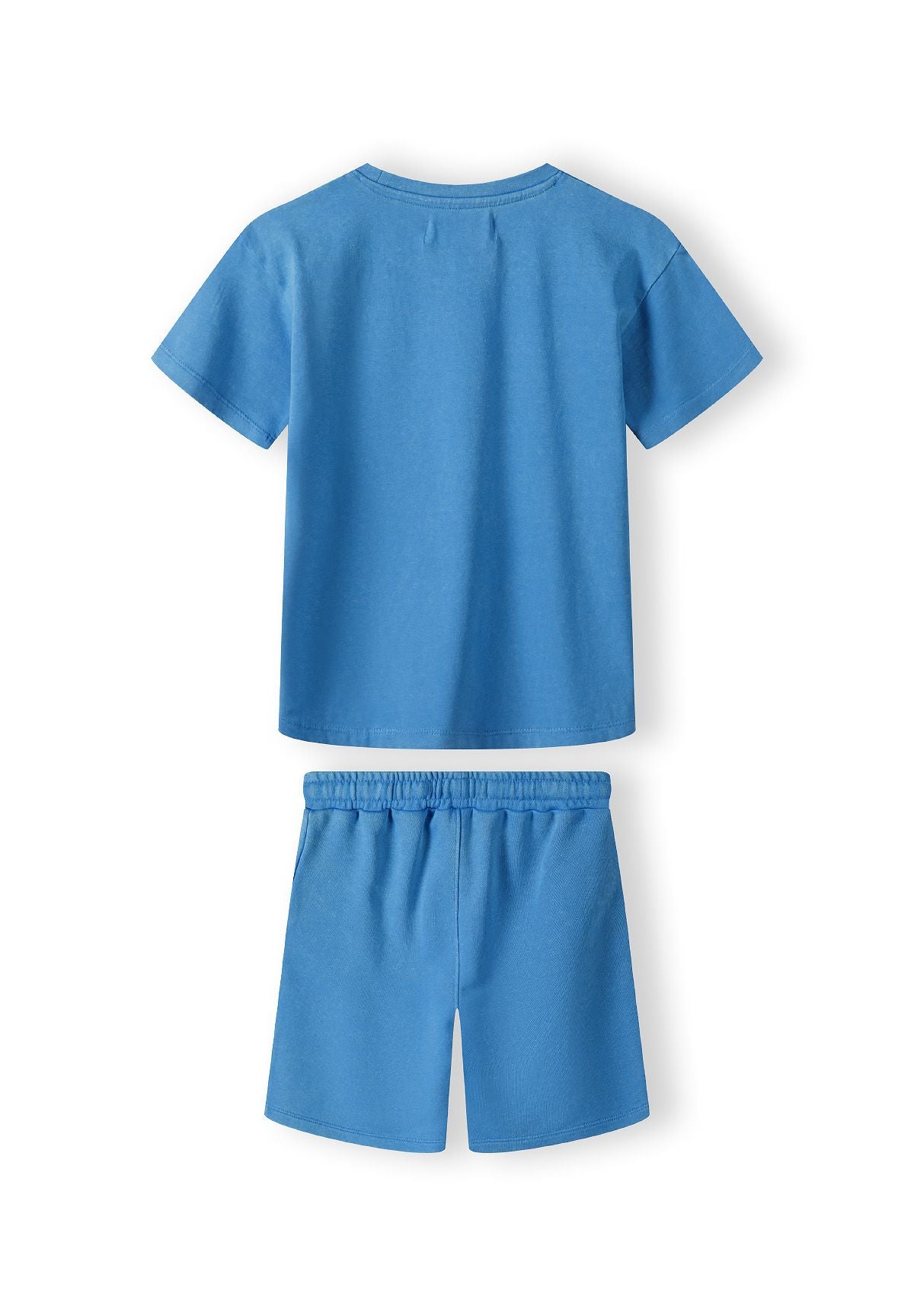 Das Jungen-Set mit kurzärmeligem T-Shirt und Shorts umfasst ein T-Shirt und passende Shorts, die für den lässigen Alltagsgebrauch entworfen wurden. Das T-Shirt hat kurze Ärmel, einen Rundhalsausschnitt und ein aufgedrucktes Motiv auf der Brust, das für visuelles Interesse sorgt. Die Shorts verfügen über einen elastischen Bund mit Kordelzug, der eine individuelle und bequeme Passform ermöglicht. Funktionale Seitentaschen bieten praktische Aufbewahrungsmöglichkeiten. Sowohl T-Shirt als auch Shorts sind mit gedruckten Motiven für einen abgestimmten Look versehen. Der weiche Fleece-Jersey-Stoff mit Wascheffekt unterstreicht den lässigen Stil und sorgt für atmungsaktiven Komfort. Die lockere Passform erlaubt uneingeschränkte Bewegungsfreiheit, was sie ideal für das Spielen im Freien oder das Tragen bei warmem Wetter macht. Die Hauptfarbe ist Blau, passend zu den saisonalen Vorlieben für Kinder-Sommerkleidung.