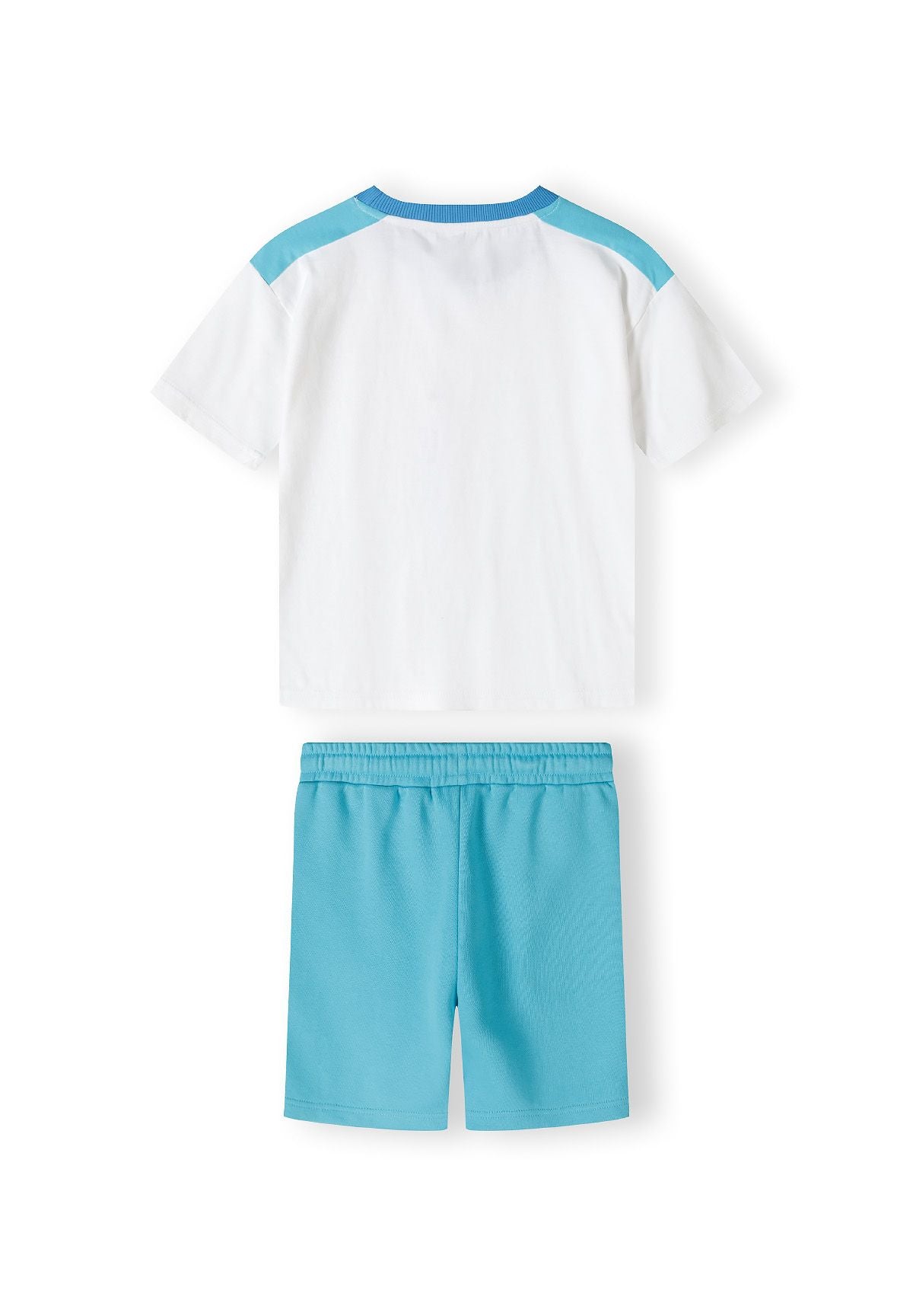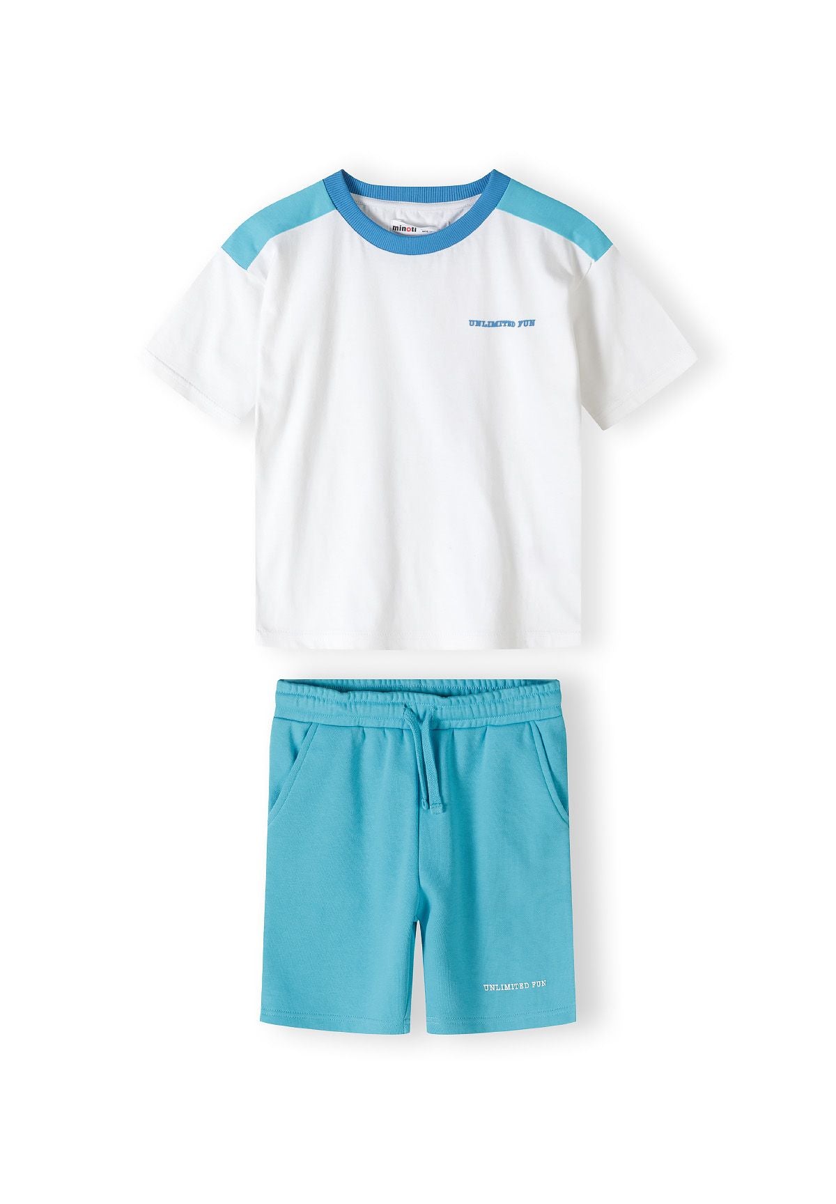 Das zweiteilige Set für Jungen besteht aus einem kurzärmeligen Jersey-T-Shirt und Fleece-Shorts in kontrastierenden Farben, die für den Freizeitgebrauch entworfen wurden. Das T-Shirt ist aus weichem Jersey-Stoff gefertigt und verfügt über einen Rundhalsausschnitt sowie einen Brustdruck, der ein dezentes dekoratives Element hinzufügt. Die Fleece-Shorts verbinden Wärme und Komfort mit Atmungsaktivität, wodurch sie sich für aktive Nutzung eignen. Sie haben einen elastischen Bund mit Kordelzug, der für einen sicheren und verstellbaren Sitz sorgt. Praktische Seitentaschen an den Shorts ermöglichen eine bequeme Aufbewahrung. Der Beinaufdruck auf den Shorts passt zum Design des T-Shirts und sorgt für ein stimmiges Erscheinungsbild. Beide Teile bieten eine lockere Passform, die Bewegungsfreiheit in wärmeren Jahreszeiten unterstützt und den Tragekomfort gewährleistet.