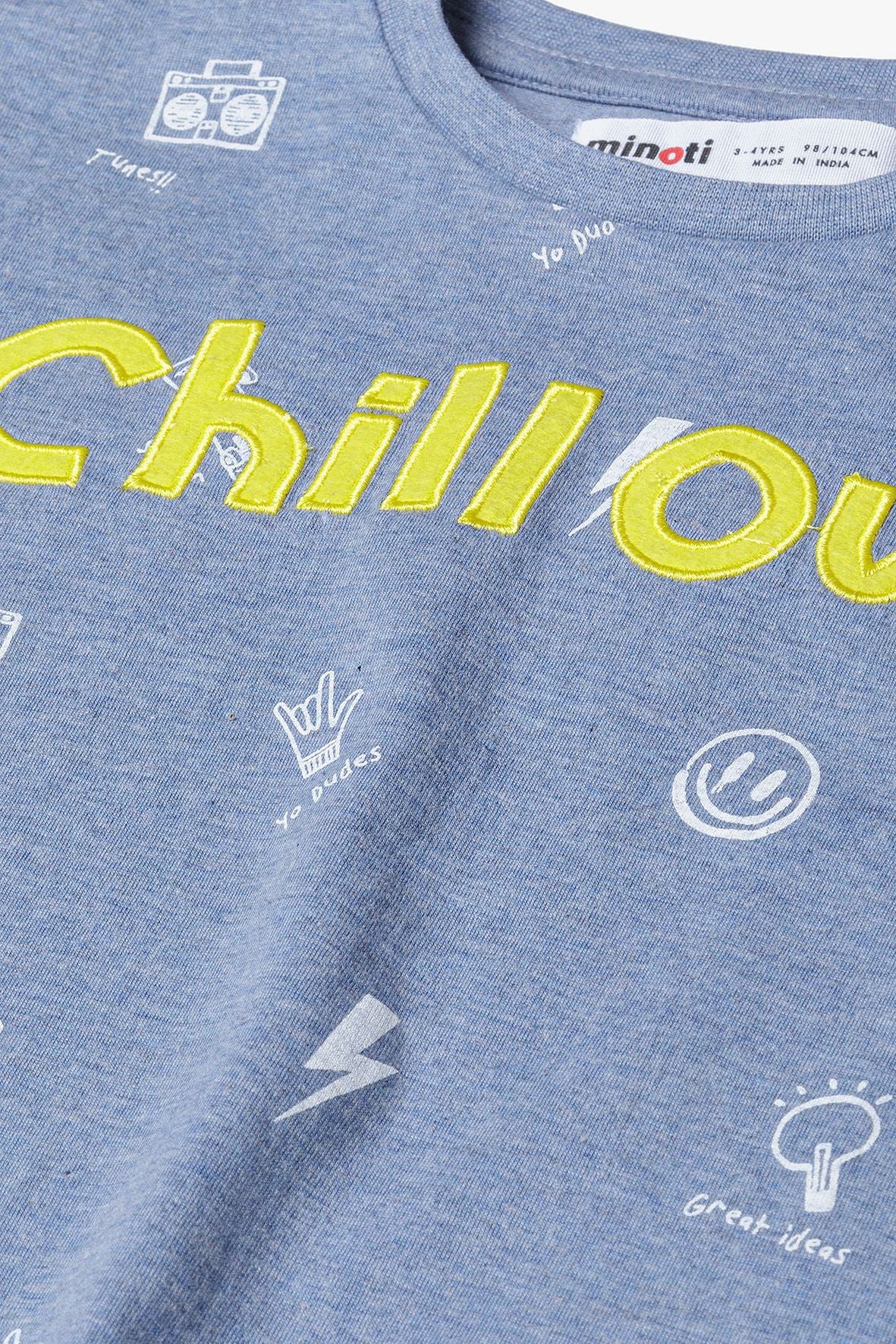 Ein Jungen-T-Shirt für den lässigen Alltagsgebrauch, das eine blaue Grundfarbe mit einem durchgehenden Grafikdruck auf dem gesamten Stoff zeigt. Es verfügt über einen traditionellen Rundhalsausschnitt und kurze Ärmel, die für eine klassische, bequeme Passform sorgen, ideal für wärmere Tage. Im Brustbereich befindet sich ein auffälliger Applikationsslogan, der einen klaren optischen Akzent setzt, ohne den Tragekomfort zu beeinträchtigen. Das Design ist auf Bewegungsfreiheit und Atmungsaktivität ausgelegt und eignet sich gut für aktives Spielen und sommerliche Bedingungen. Die vielseitige Gestaltung lässt sich gut mit Jogginghosen kombinieren, um ein sportlich-lässiges Outfit zu schaffen. Die Verarbeitung und Stoffwahl legen Wert auf praktische, häufige Nutzung, ohne dabei auf optische Anziehungskraft oder Funktionalität zu verzichten.