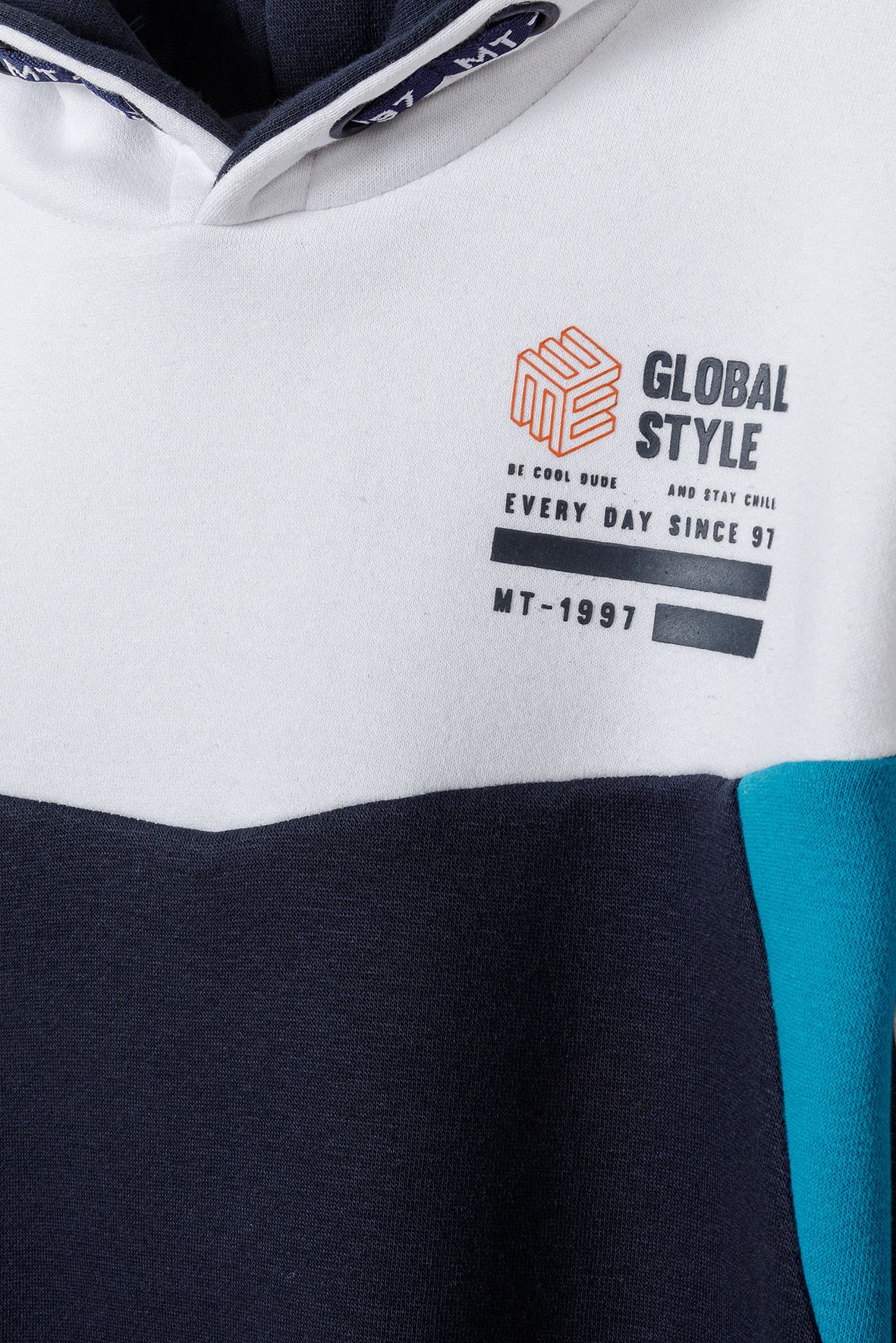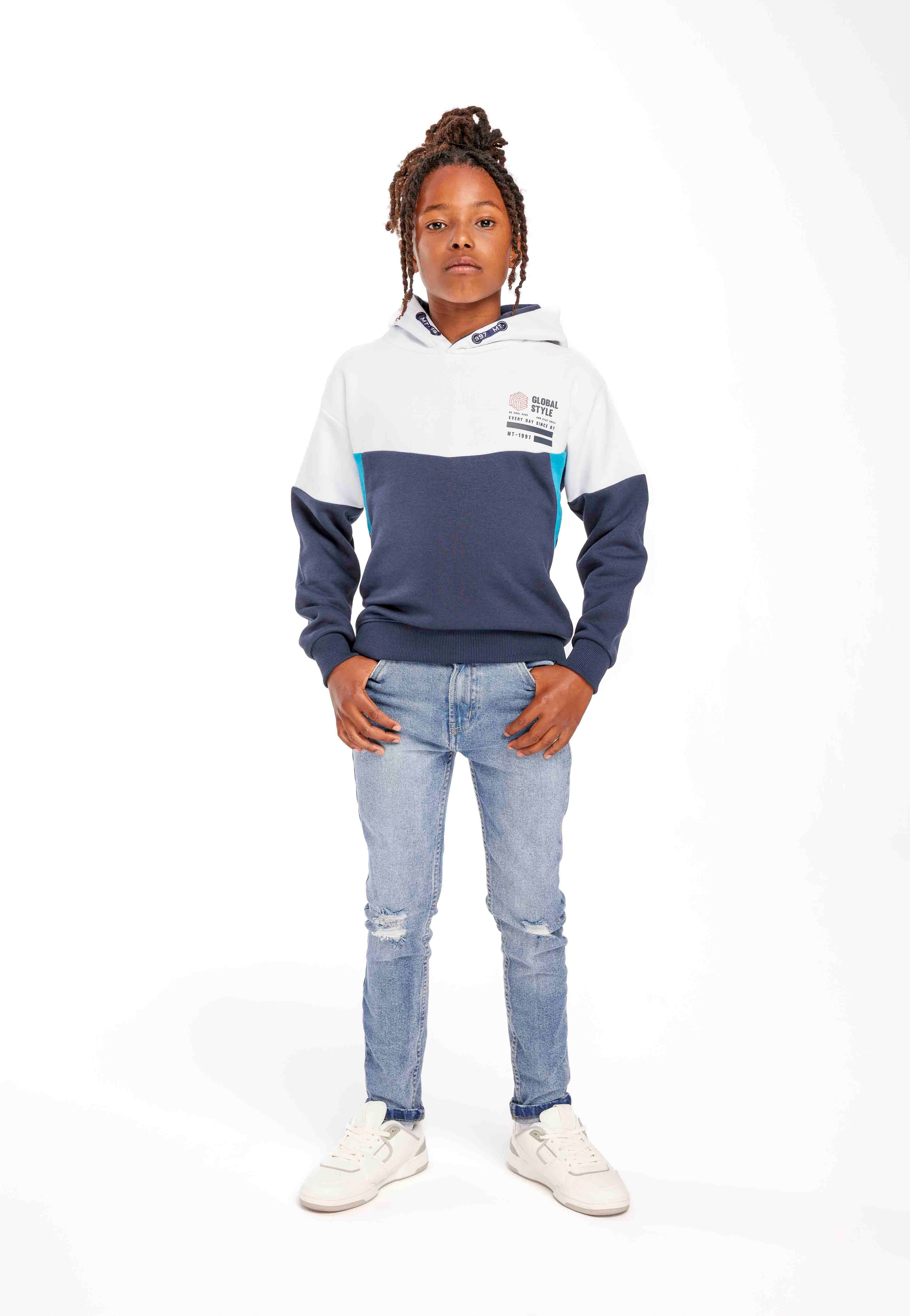 Der Jungenpullover mit Kapuze ist für den lässigen Wintergebrauch entworfen und zeigt eine marineblaue Grundfarbe mit kontrastierenden Einsätzen am Körper und an den Ärmeln für zusätzliche optische Akzente. Er verfügt über eine weich gefütterte Innenseite der Kapuze in einem passenden Ton, der das geschichtete Aussehen verstärkt. Die überschnittene Schulterpartie sorgt für eine lockere Passform und erhöht den Tragekomfort bei alltäglichen Aktivitäten. Ein aufgedrucktes Motiv auf der Brust fügt ein dezentes stilistisches Detail hinzu. Gerippte Bündchen an Ärmeln und Saum gewährleisten einen sicheren Sitz, der Wärme speichert und kalte Zugluft wirkungsvoll abhält. Der vielseitige Kapuzenpullover lässt sich gut mit Jeans oder Hosen kombinieren und bietet praktische Schichtmöglichkeiten für unterschiedliche Winteroutfits, wobei er Komfort und Funktionalität in Einklang bringt.