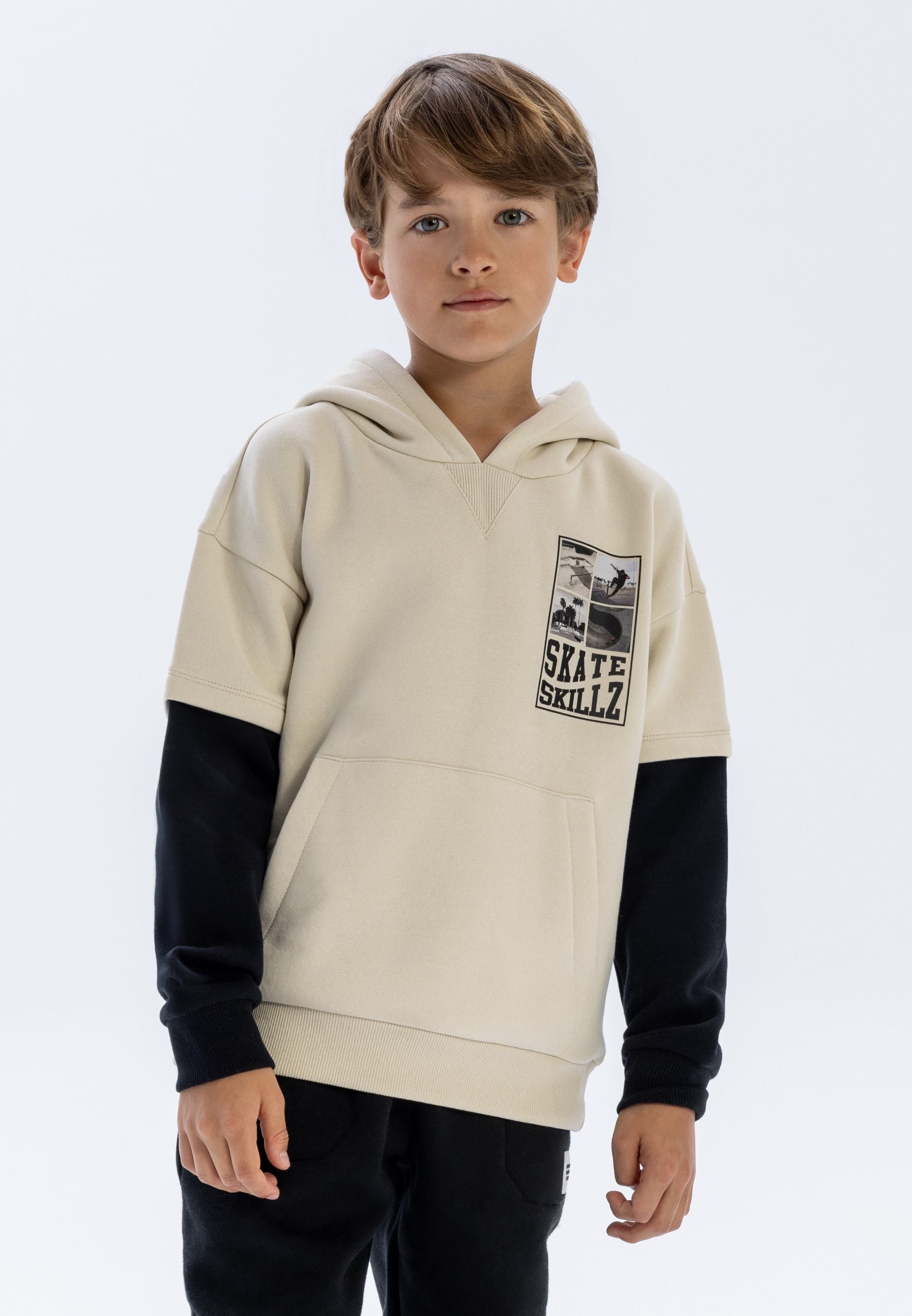Ein lässiger Hoodie für Jungen, der für kühlere Jahreszeiten entworfen wurde. Er präsentiert sich in einem vielseitigen Grauton mit einem simulierten Doppelärmel-Effekt, der den Eindruck von Lagenkleidung vermittelt, ohne zusätzliches Volumen zu erzeugen. Der Stoff ist leicht und weich, bietet angenehme Wärme für Herbst- und Wintertage und sorgt gleichzeitig für Bewegungsfreiheit. Vorne befindet sich eine Kängurutasche, die praktischen Stauraum für kleine Gegenstände bietet oder als Handwärmer dient. Gerippte Bündchen und ein gerippter Saum sorgen für eine enge, sichere Passform, die die Wärme speichert und den Tragekomfort erhöht. Das Design ist schlicht und funktional, wodurch sich der Hoodie leicht mit verschiedenen Freizeitoutfits kombinieren lässt. Das Kleidungsstück ist vielseitig einsetzbar für den Alltag oder verschiedene Outdoor-Aktivitäten und garantiert praktischen Stil in den kälteren Monaten.