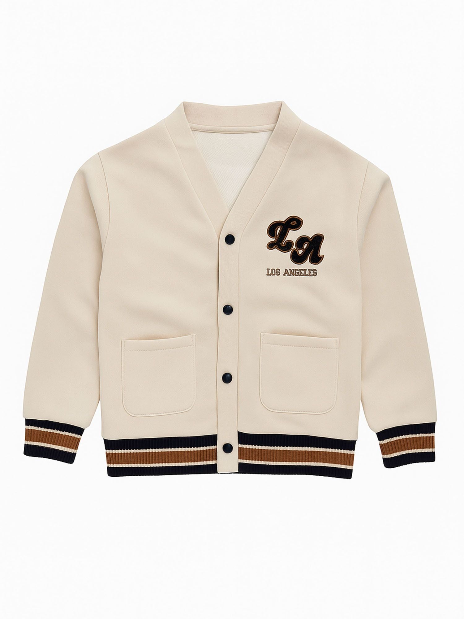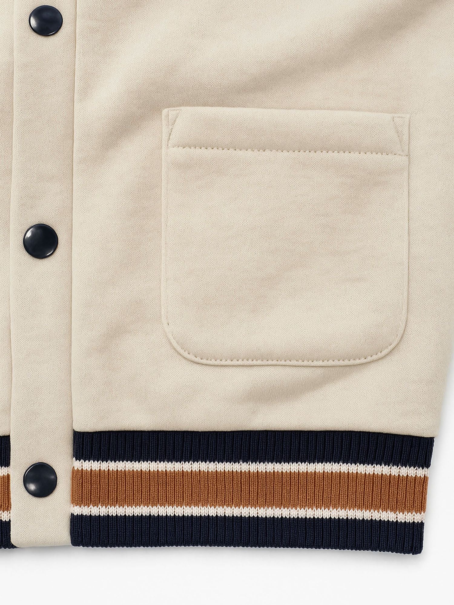 Hergestellt aus weichem, mittelschwerem Baumwollfleece, sorgt dieses cremefarbene Jungen-Sweatshirt für Wärme, sodass das Kleidungsstück an kühleren Tagen allein getragen oder unter Oberbekleidung für zusätzlichen Komfort geschichtet werden kann. Die strukturierte Passform bietet eine moderne, gepflegte Silhouette und ermöglicht gleichzeitig uneingeschränkte Bewegungsfreiheit, ideal für aktive Kinder. Das Knopfverschluss-System erleichtert das An- und Ausziehen sowie die Anpassung, während gerippte Bündchen und Saum mit kontrastfarbener Einfassung für einen sicheren Sitz sorgen und dezente optische Akzente setzen. Die auffällige Brustapplikation verleiht einen sportlichen Akzent, und zwei große aufgesetzte Fronttaschen bieten praktischen Stauraum.