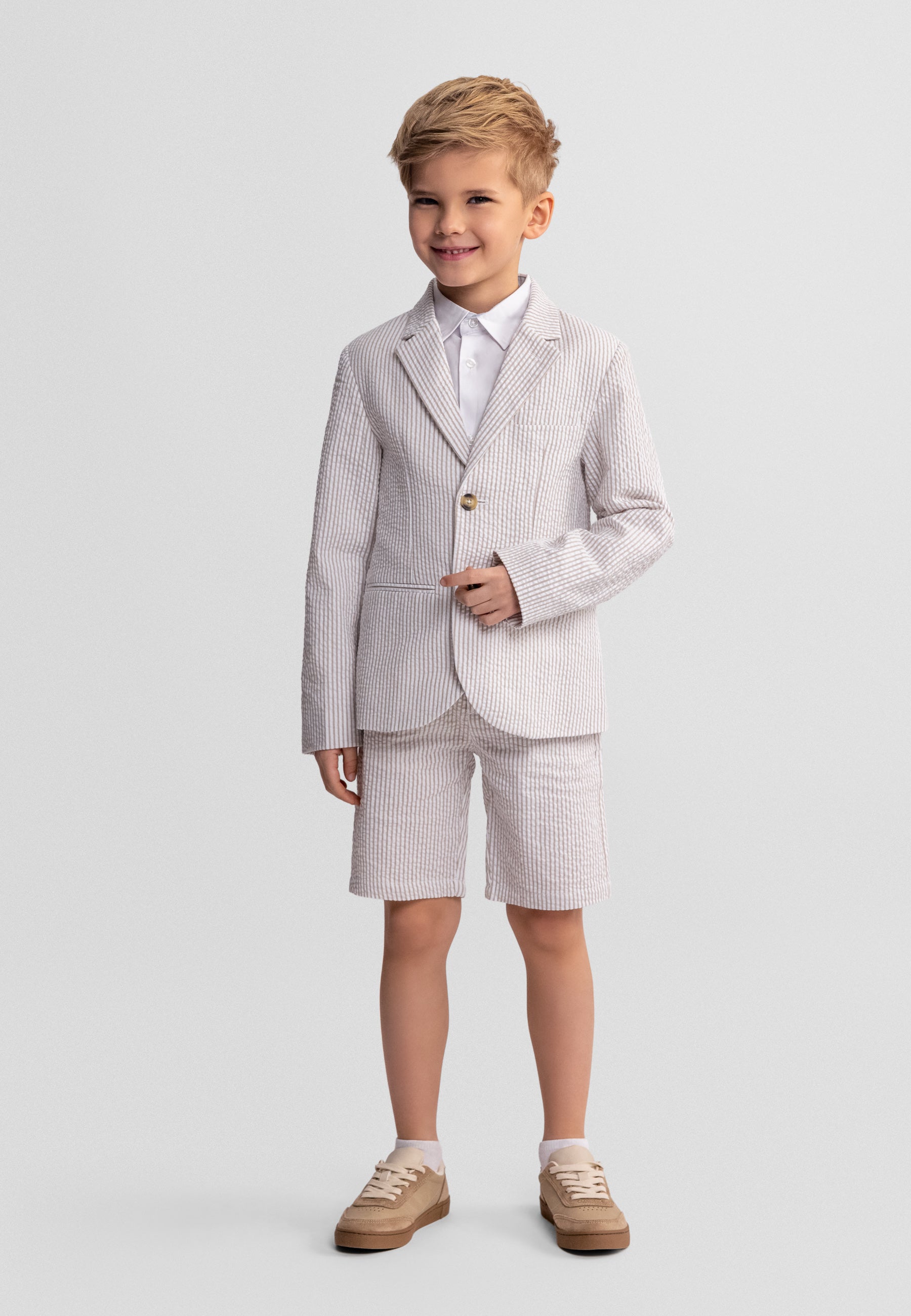 Hergestellt aus gewebter Baumwolle, sorgt dieser Jungen-Blazer in Stein mit Streifenmuster für Atmungsaktivität und Komfort, was ihn ideal für den ganzen Tag macht. Das glatte Polyesterfutter ermöglicht Bewegungsfreiheit, während der klassische Reverskragen und die vordere Knopfleiste einen zeitlosen, gepflegten Look schaffen. Das dezente Streifenmuster in Steinfarbe verleiht eine raffinierte Eleganz.