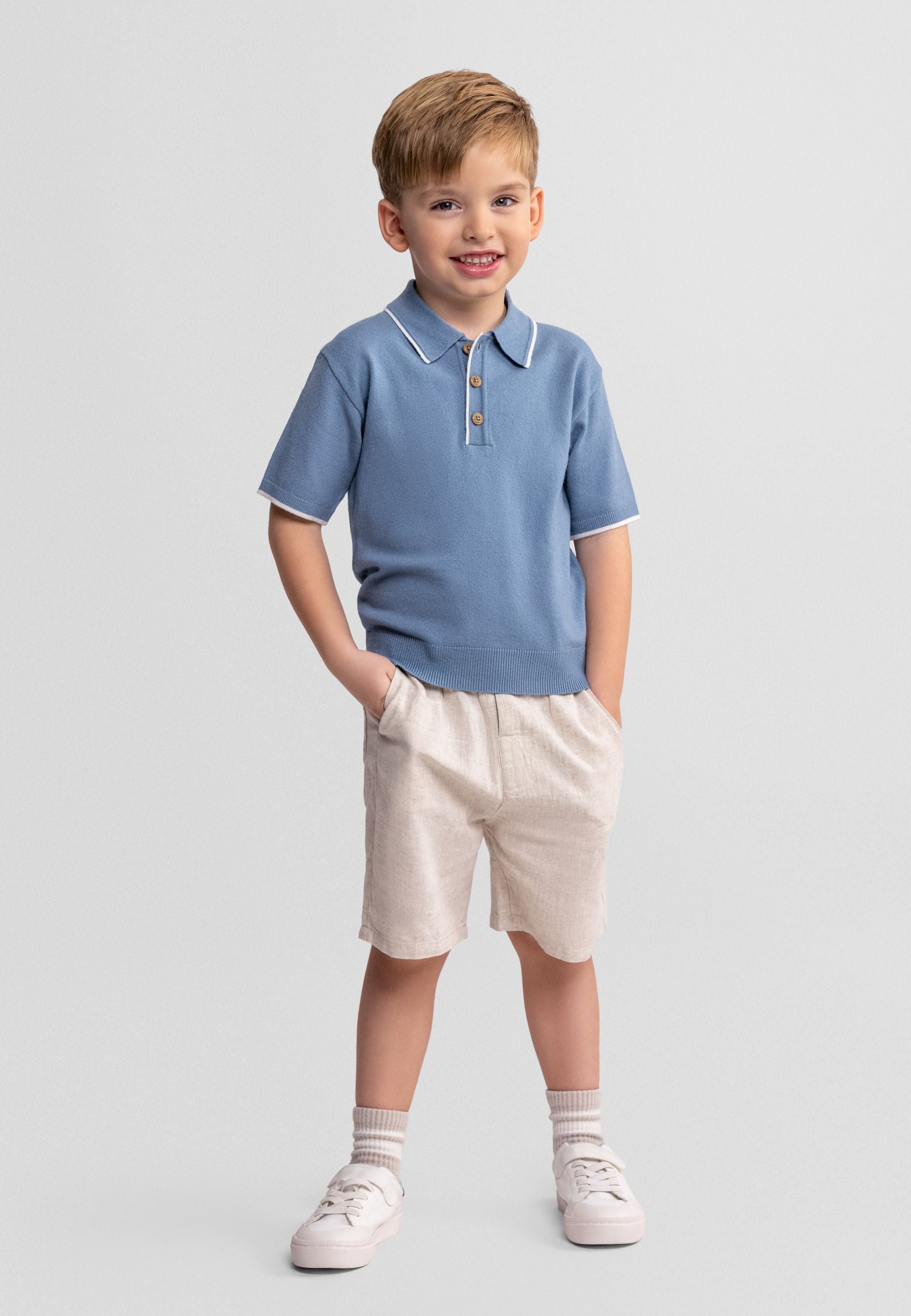 Stilvolles Jungen-Set mit einem gestrickten, hellblauen Kurzarm-Poloshirt kombiniert mit beigen Leinen- und Baumwollshorts, geeignet für Kinder von 3 Monaten bis 7 Jahren. Dieses abgestimmte Outfit vereint Komfort und Stil und ist perfekt für wärmere Jahreszeiten und den Alltag.