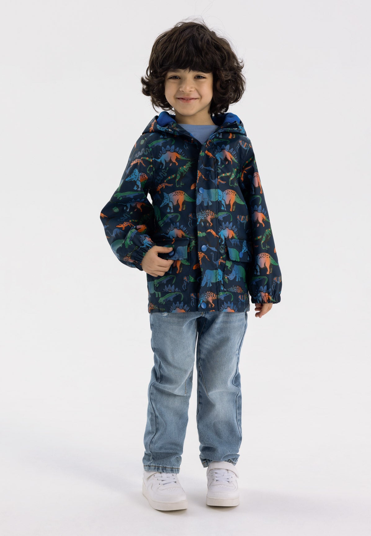 Die Jungen-Regenjacke bietet verlässlichen Schutz vor Regen und nassem Wetter. Sie hat eine dunkelblaue Grundfarbe mit einem durchgehenden Muster, das speziell für Jungen mit einer Körpergröße von 92-164 cm entworfen wurde. Die Jacke besteht aus einem leichten Stoff, der Bewegungsfreiheit und Komfort bei Aktivitäten im Freien unterstützt. Wichtige Merkmale sind ein durchgehender Reißverschluss vorne und eine angenähte Kapuze, die Schutz vor Regen und Wind bieten. Die gerippten Bündchen sorgen für einen festen Sitz an den Handgelenken und helfen, das Eindringen von Wasser zu verhindern. Zwei Vordertaschen bieten praktischen Stauraum für kleine Gegenstände. Der Stoff ist leicht zu waschen und zu pflegen, was Langlebigkeit und Eignung für den täglichen Gebrauch gewährleistet.