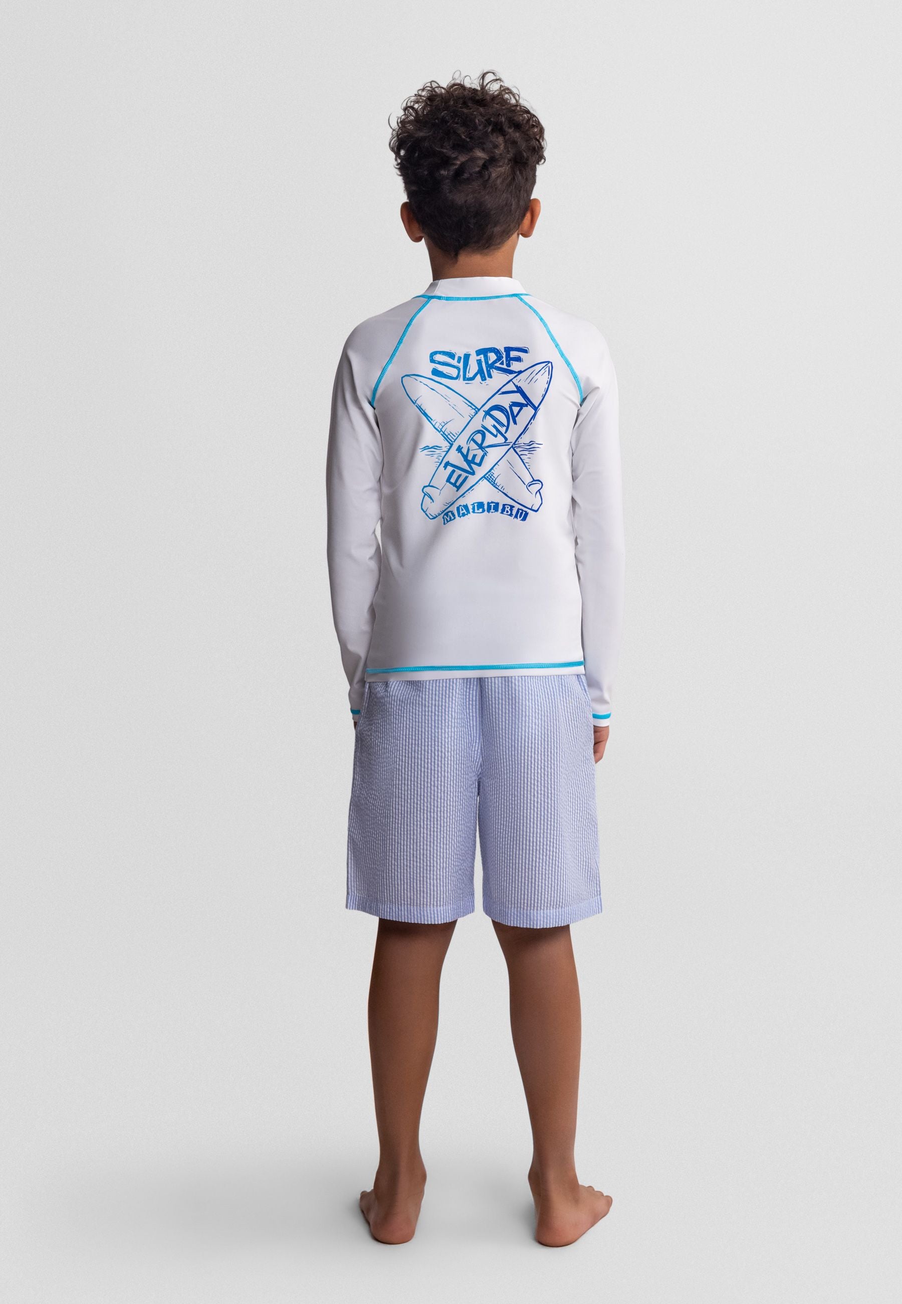 Hergestellt aus 85 % Polyester und 15 % Elasthan, besteht dieses weiße Ombre-Blaue Jungen-Rashguard-Set aus leichtem Stoff mit dezentem Stretch, der Bewegungsfreiheit unterstützt. Das atmungsaktive, schnell trocknende Material behält Form und leuchtende Farben auch nach Maschinenwäschen bei, was es ideal für aktive Wasseraktivitäten und warme Tage macht.