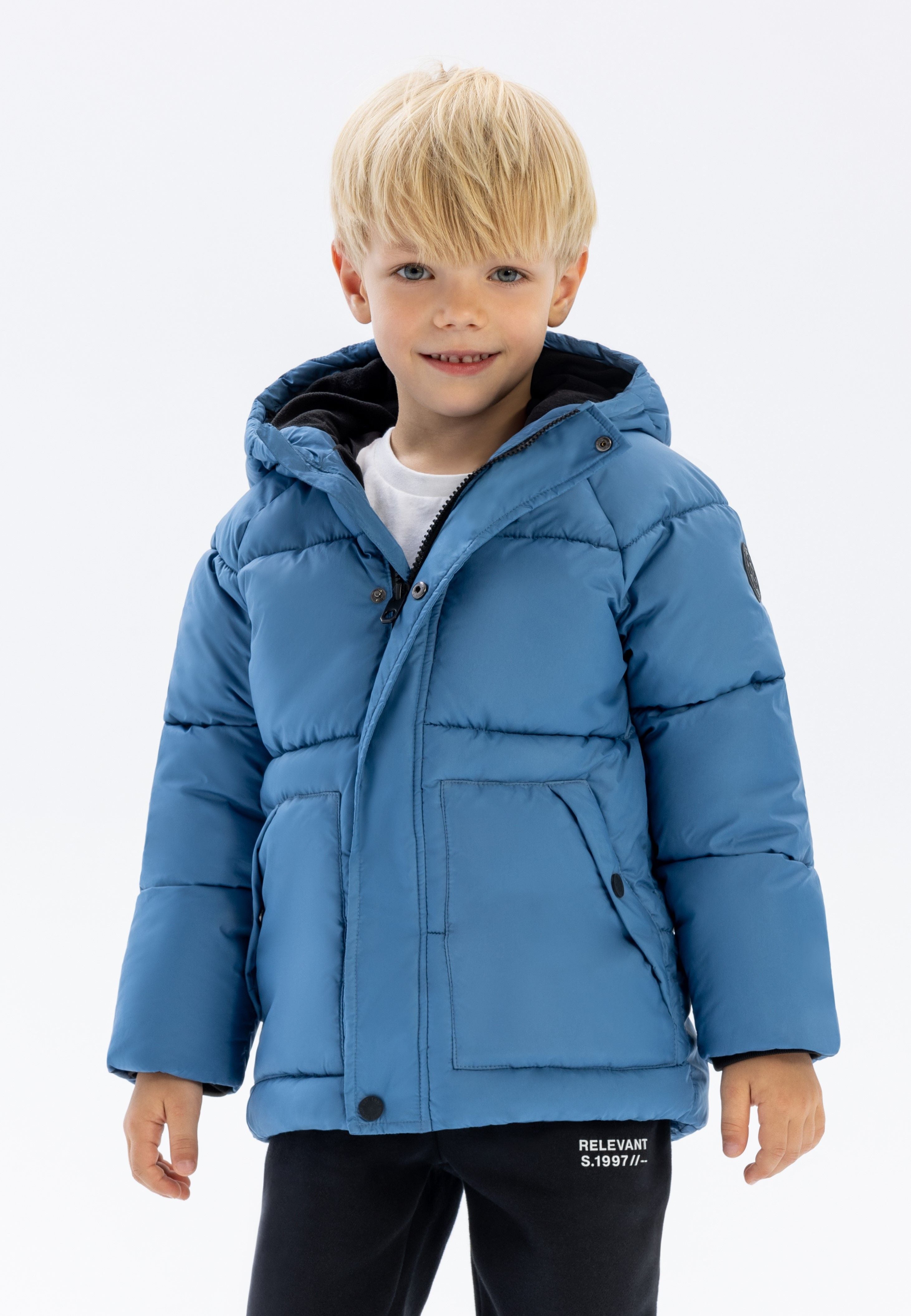 Gefütterte Jungenjacke in Mittelblau, gefertigt aus strapazierfähigem Steppstoff für effektive Isolierung und Schutz vor Wind und Kälte. Mit Raglanärmeln für verbesserte Beweglichkeit, elastischen Bündchen zum Wärmeerhalt, großen Fronttaschen für praktische Aufbewahrung, einem Frontreißverschluss und einem Ärmelabzeichen ist diese funktionale und stylische Jacke ideal für den Alltag und Outdoor-Aktivitäten bei kaltem Wetter für Jungen von 9 Monaten bis 8 Jahren.
