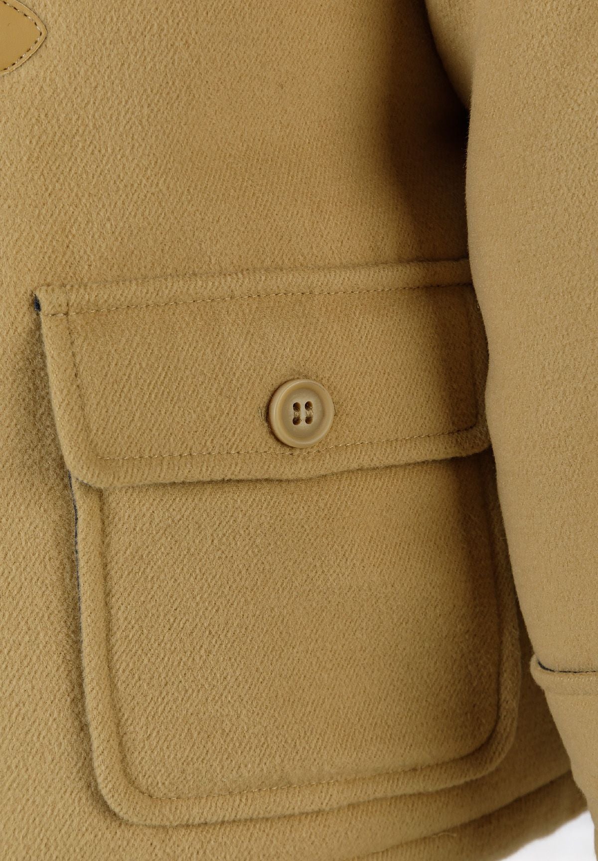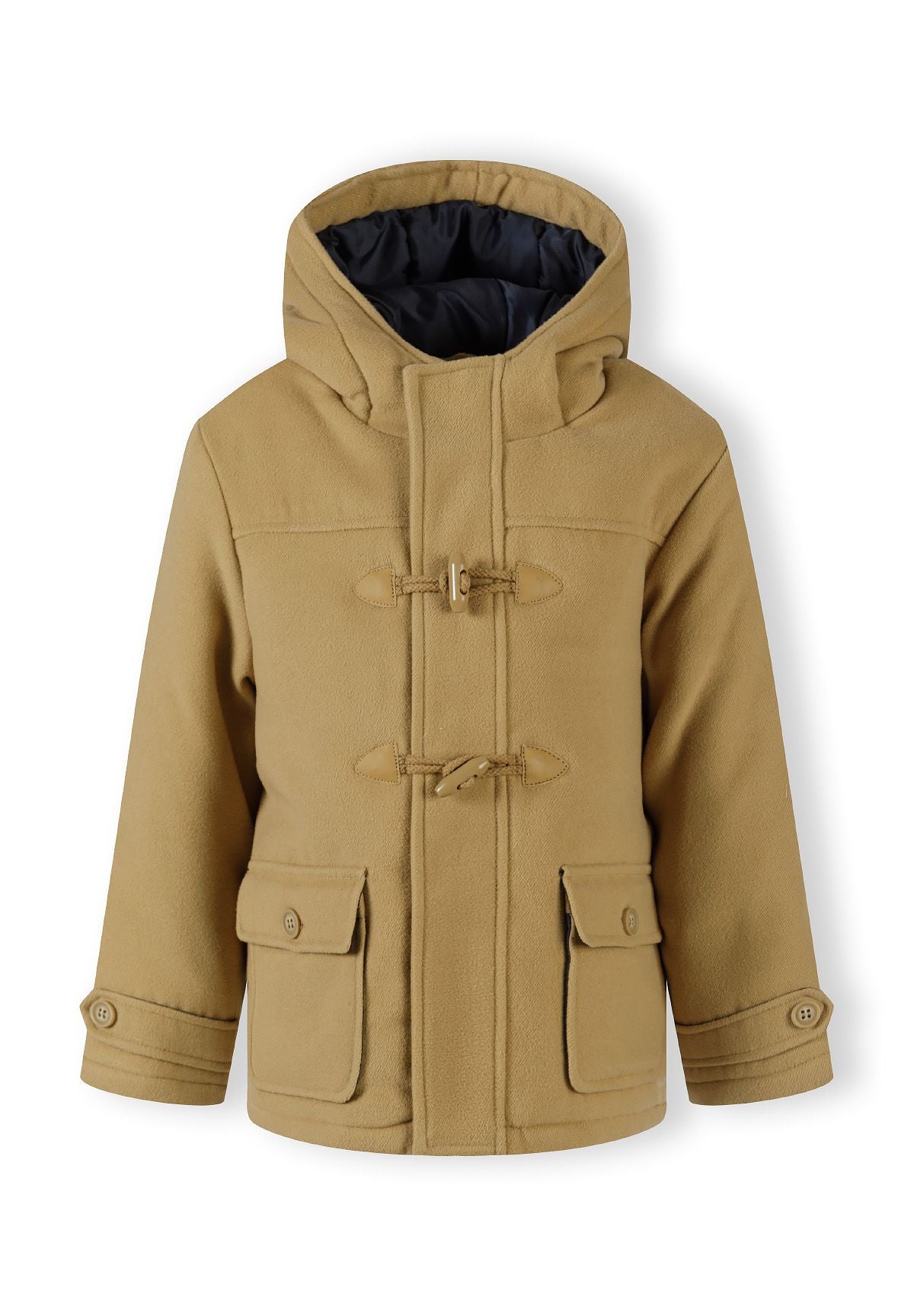 Eine gesteppte Jacke, die für Jungen entworfen wurde, um sie in kälteren Jahreszeiten zu tragen, mit einer klassischen Dufflecoat-Silhouette. Die Jacke ist hauptsächlich beige und verfügt über ein zweifarbiges, gesteppte Futter, das zusätzliche Wärme bietet und einen markanten, kontrastierenden visuellen Akzent setzt. Sie hat eine reguläre Passform, die Komfort und Praktikabilität gewährleistet.