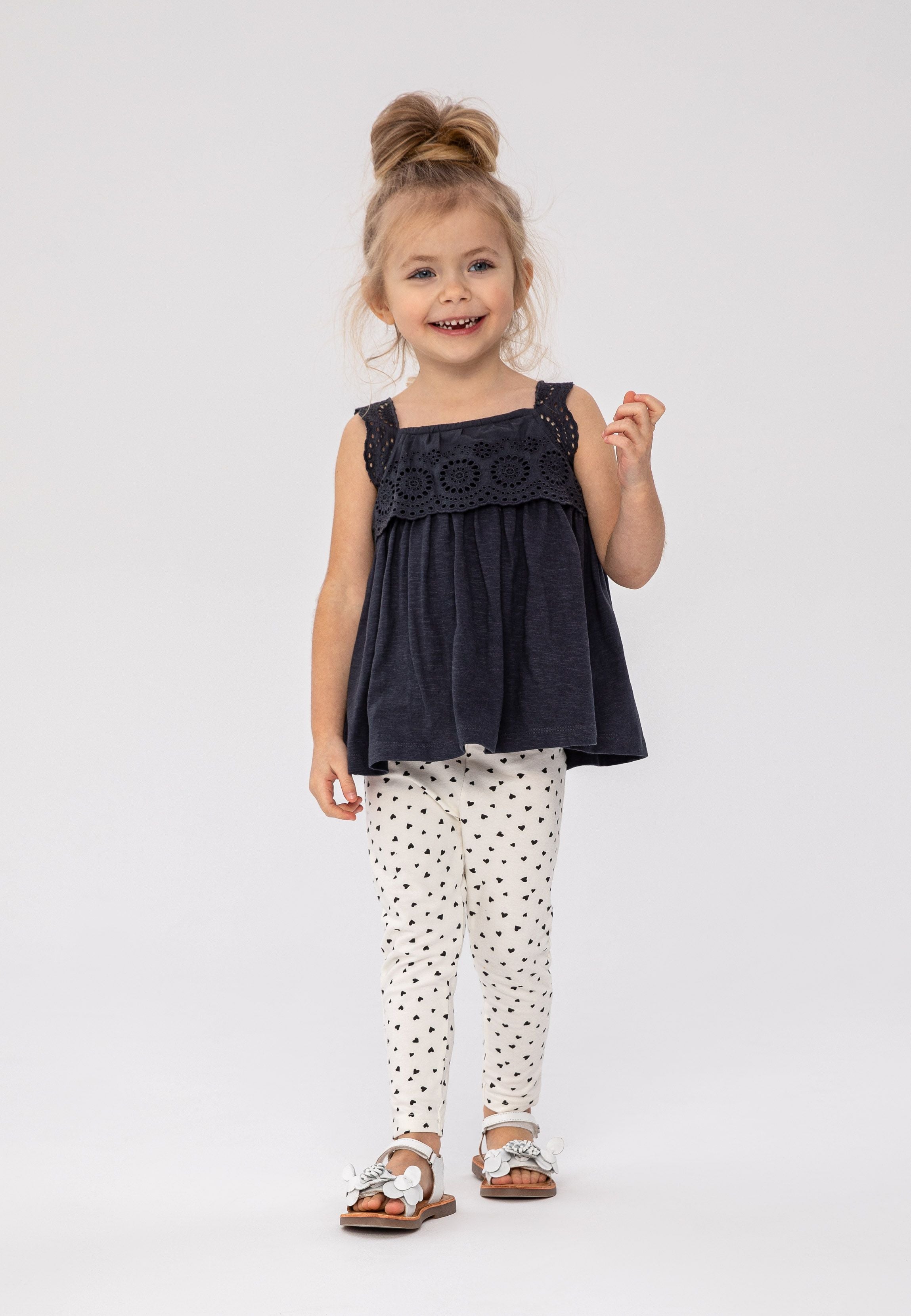 Das zweiteilige Mädchen-Set besteht aus einem Broderie-Rüschentop und bedruckten Leggings, die Komfort und abgestimmten Stil bieten. Das Top ist aus weichem, leichtem Stoff in einem dezenten Grauton gefertigt und verfügt über eine Broderie-Rüsche entlang des Halsausschnitts sowie zarte Schulterträger, die dekorative und zugleich funktionale Details hinzufügen. Die Leggings zeigen ein durchgehendes Herzmuster und sind mit einem elastischen Bund ausgestattet, der einen sicheren Sitz gewährleistet, das Anziehen erleichtert und uneingeschränkte Bewegungsfreiheit bietet. Beide Kleidungsstücke kommen ohne zusätzliche Verschlüsse aus, was eine glatte Silhouette und Bequemlichkeit beim Tragen sicherstellt. Das praktische Outfit eignet sich für den Alltag oder legere Sommeranlässe und verbindet sanfte ästhetische Akzente mit funktionaler Verarbeitung für Kinderbekleidung.