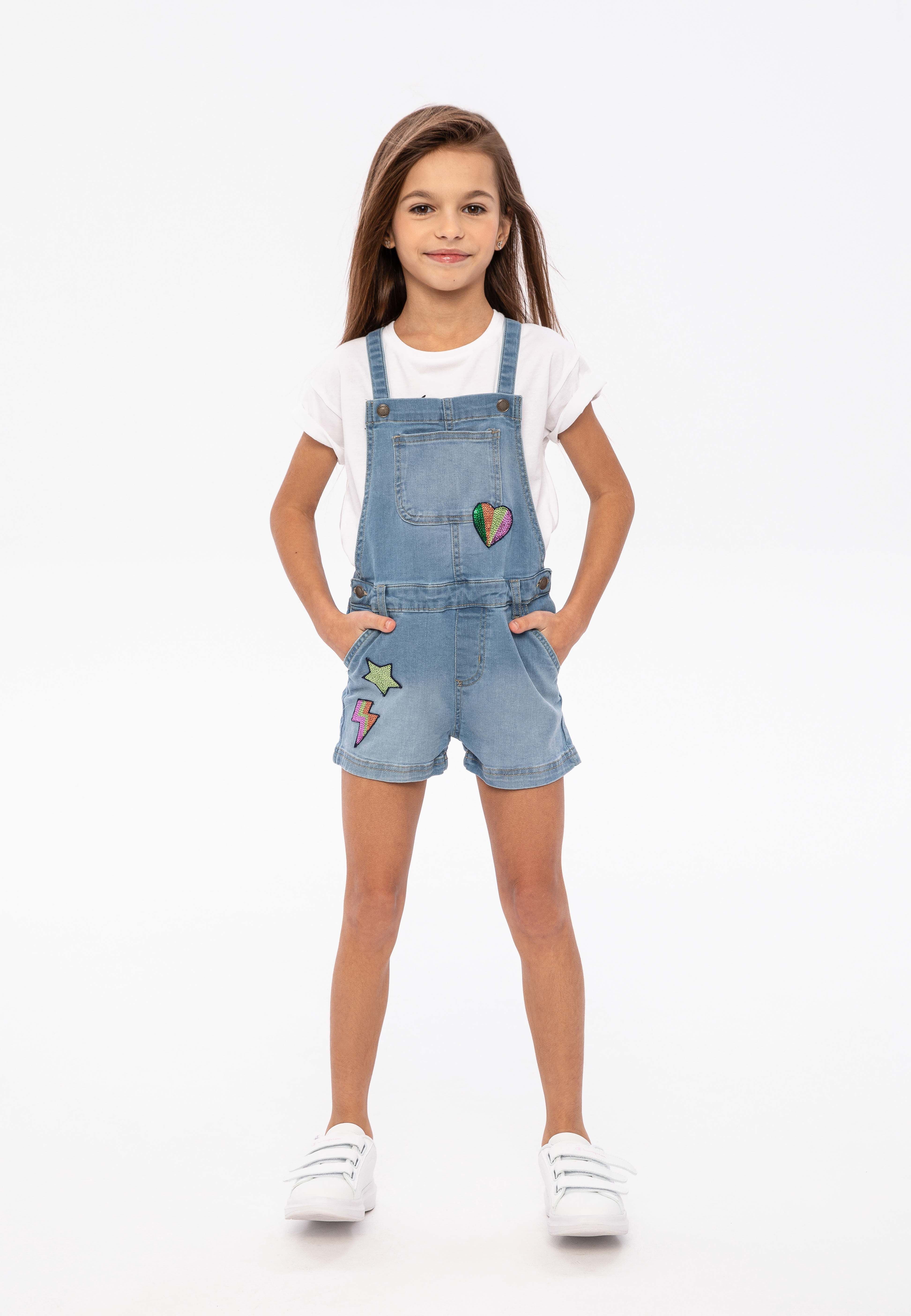 Mädchen Jeans-Short-Latzhose mit neonfarbenen Pailletten blau 1-8 Jahre