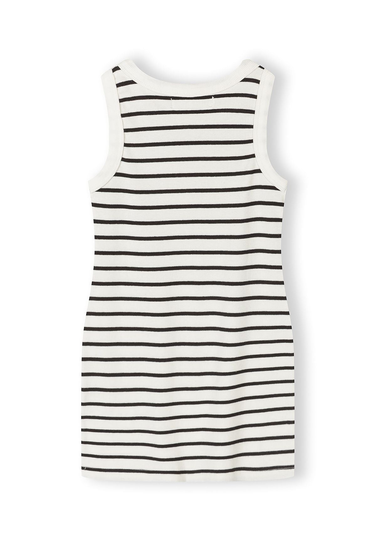 Ein zeitloses Mädchenkleid mit klassischen schwarz-weißen horizontalen Streifen in einer ärmellosen, gerade geschnittenen Silhouette. Hergestellt aus weichem Rippjersey, vereint dieses vielseitige Kleidungsstück Komfort mit mühelosem Stil – ideal für den Alltag und besondere Anlässe.