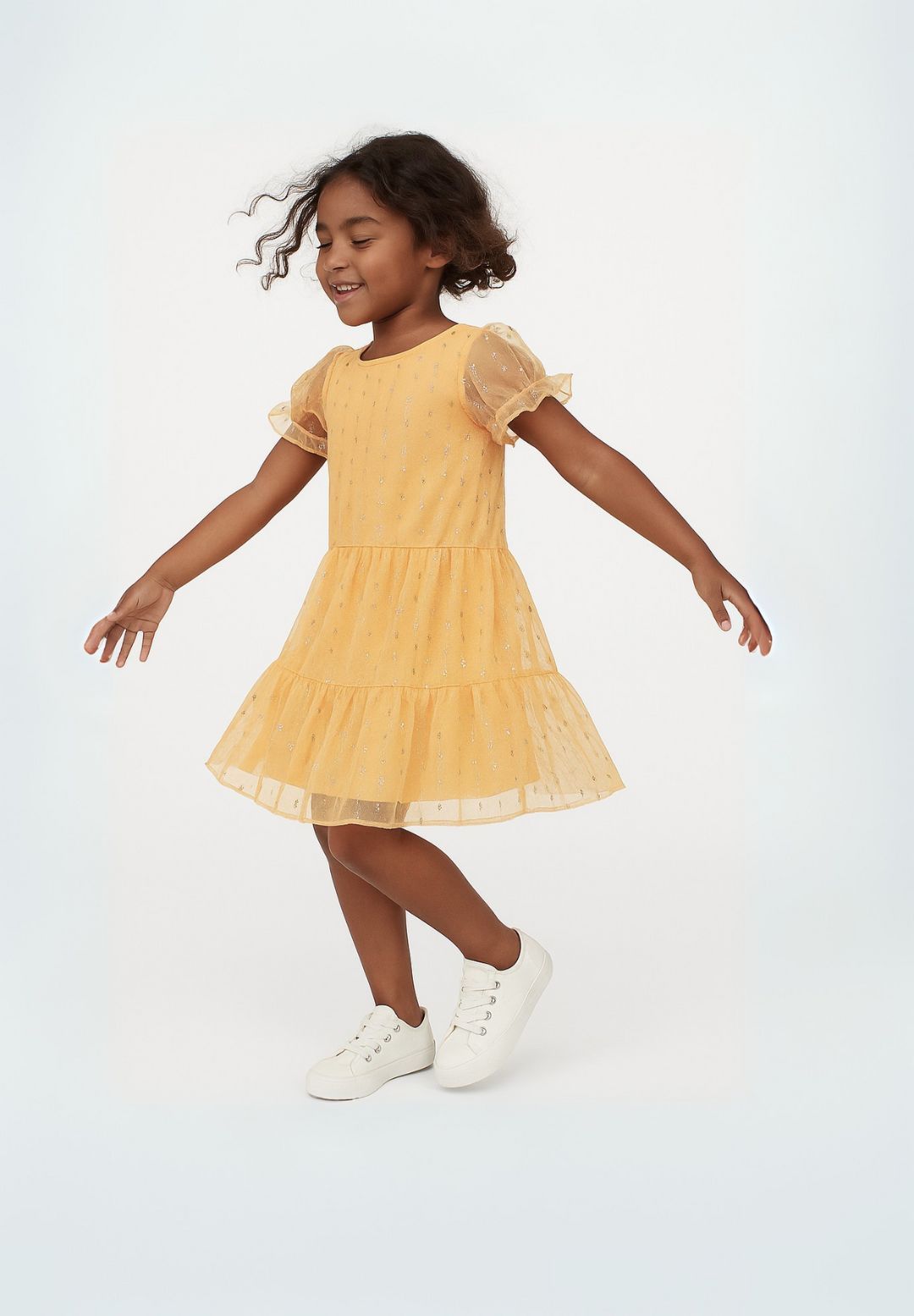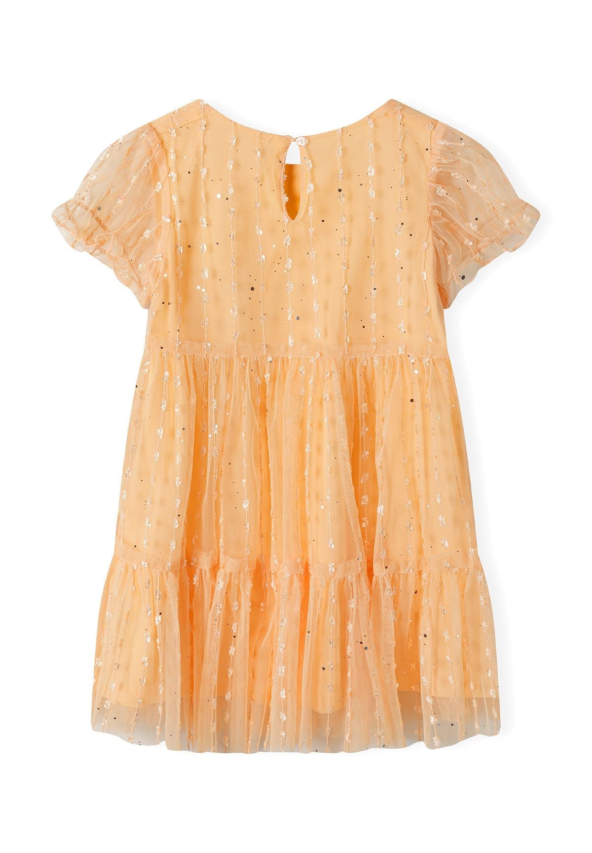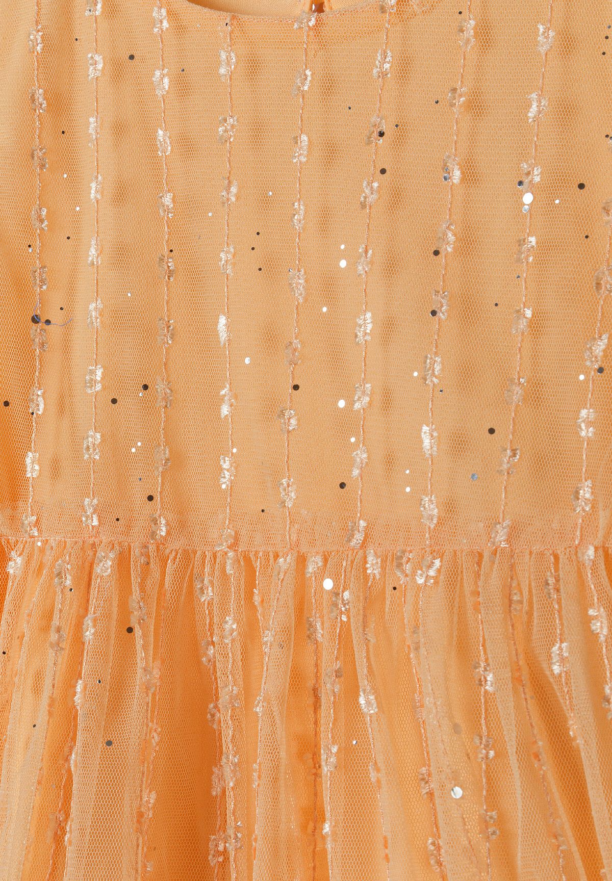 Ein Mädchen-Party-Kleid aus strukturiertem Glitzertüll in einem leuchtenden Orangeton, entworfen für besondere Anlässe und Feierlichkeiten. Das Kleid ist speziell für Mädchen zugeschnitten und verfügt über kurze Mesh-Ärmel, die einen zarten und atmungsaktiven Abschluss bieten. Der gestufte Rock verleiht Volumen und ermöglicht eine anmutige Bewegung, was das festliche Erscheinungsbild unterstreicht. Geeignet für Mädchen im Alter von 2 bis 14 Jahren, bietet das Kleid durch präzise Verarbeitung eine bequeme Passform. Es ist vollständig gefüttert, um das An- und Ausziehen zu erleichtern und die Haltbarkeit zu verbessern. Das Design verbindet dekorativen Glanz mit funktionalen Elementen und ist somit ideal für saisonale Partys und formelle Anlässe.
