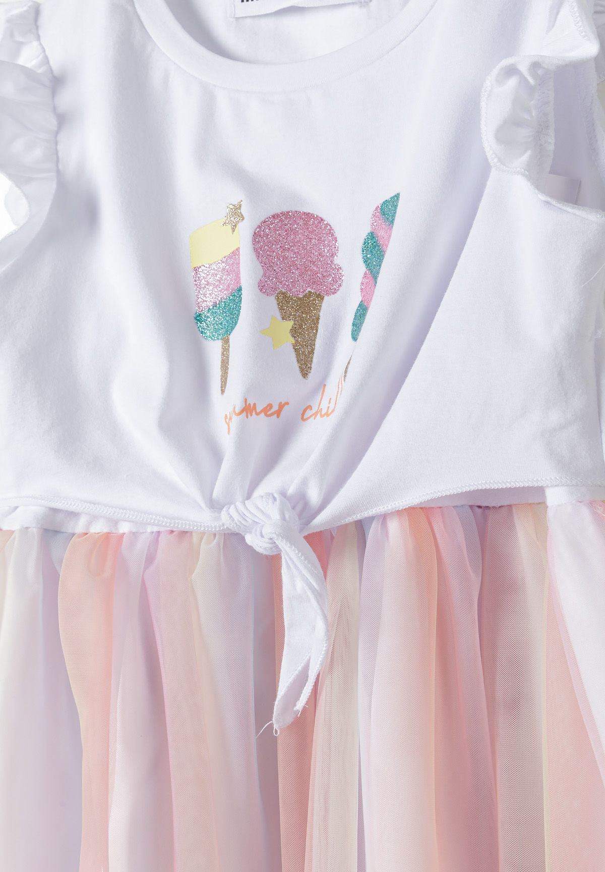 Ein Mädchenkleid, das sowohl für den Alltag als auch für besondere Anlässe geeignet ist, gefertigt aus einer Kombination aus weichem Jersey und einem zarten, mehrlagigen Mesh-Rock. Das Kleid ist weiß und verfügt über Rüschen-Ärmchen, die einen dezenten dekorativen Akzent setzen. Ein aufgedrucktes Design schmückt die Vorderseite, ergänzt durch eine Schleifenapplikation, die das Gesamtbild abrundet. Der leichte Mesh-Rock sorgt für eine atmungsaktive Lage, ideal für warmes Wetter, während der Jersey-Stoff Komfort und Bewegungsfreiheit gewährleistet. Die lockere Passform trägt zum angenehmen Tragegefühl für aktive Kinder bei. Das Kleid verfügt über einen mehrlagigen Mesh-Rock kombiniert mit einem weichen Jersey-Oberteil, das Form und Farbe auch nach dem Waschen behält und den Alltagseinsatz unterstützt.