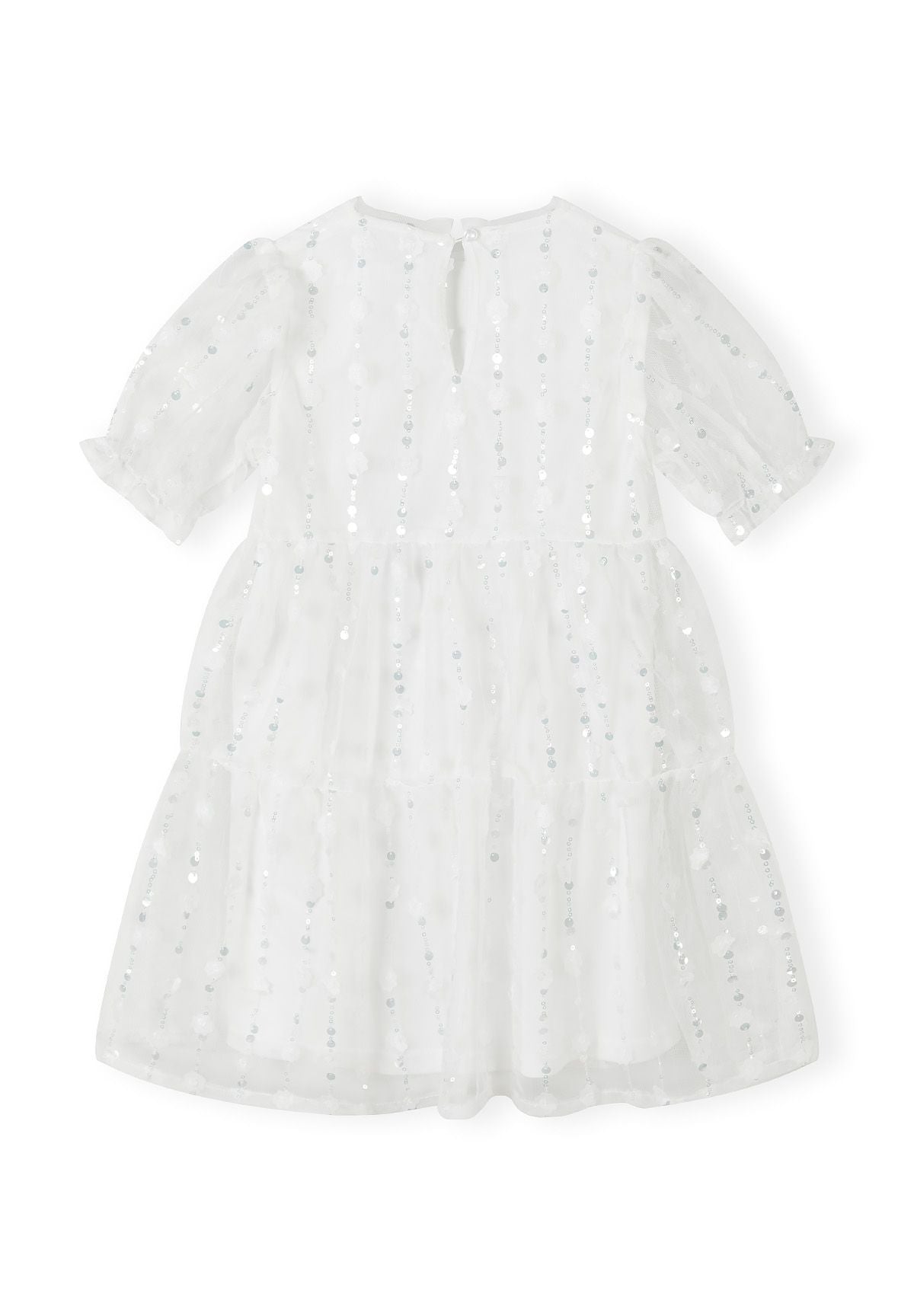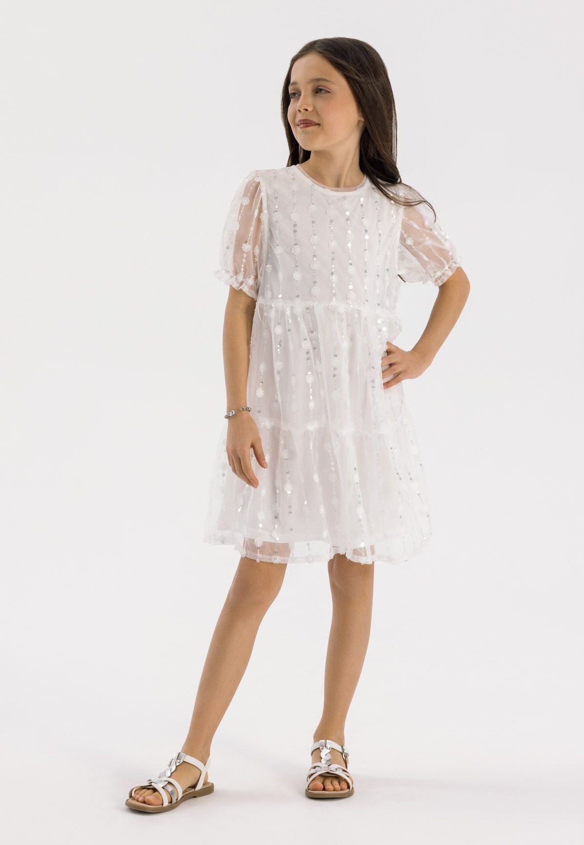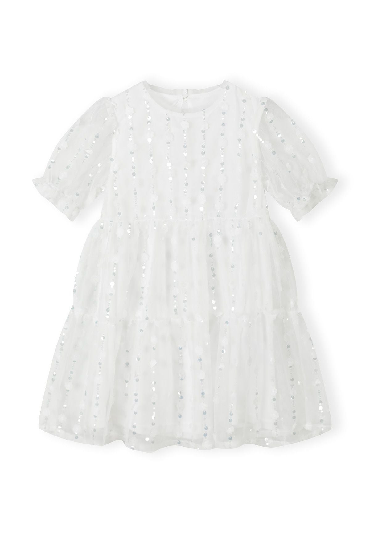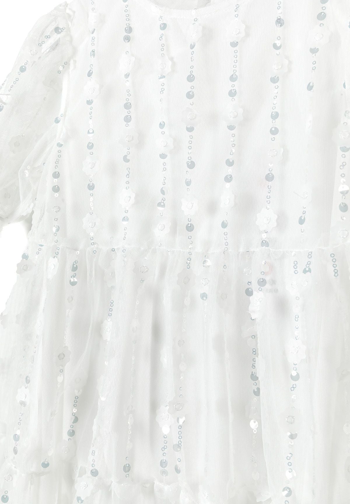 Dieses Mädchen-Kurzarmkleid vereint leichte, atmungsaktive Kleidung mit dekorativem Charme, speziell für Frühling und Sommer. Perfekt für verschiedene Anlässe und Events, gefertigt aus leichtem weißem Tüll, der Atmungsaktivität und Komfort bei wärmerem Wetter gewährleistet. Das Kleid ist mit funkelnden Pailletten-Blumenmotiven verziert, die dem Design eine zarte ornamentale Note verleihen, während Rüschenärmel mit elastischen Abschlüssen für einen sicheren und bequemen Sitz an den Armen sorgen.