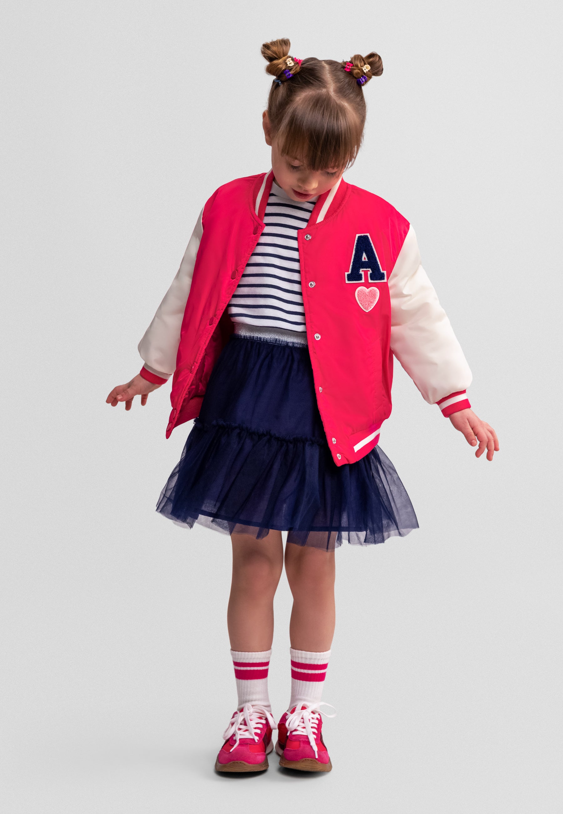 Die Mädchen-College-Bomberjacke zeigt eine klassische Silhouette, gefertigt aus robustem Polyester für langanhaltende Nutzung. Sie verfügt über ein gesteppte Polyesterfutter, das angenehme Wärme bietet, ideal für kühlere Frühjahrs- und Herbsttage, und gleichzeitig Atmungsaktivität ermöglicht. Elastische, gerippte Bündchen, Kragen und Saum sorgen für einen sicheren Sitz, der aktive Bewegungen zulässt, ergänzt durch Druckknopfverschlüsse und Seitentaschen für praktische Nutzung. Erhältlich in einem leuchtenden Pinkton mit normaler Passform, ist diese leichte Jacke eine funktionale und modische Schicht, geeignet für Kinder im Alter von 12 Monaten bis 7 Jahren, entworfen, um Form und Farbe auch bei häufigem Tragen zu bewahren.
