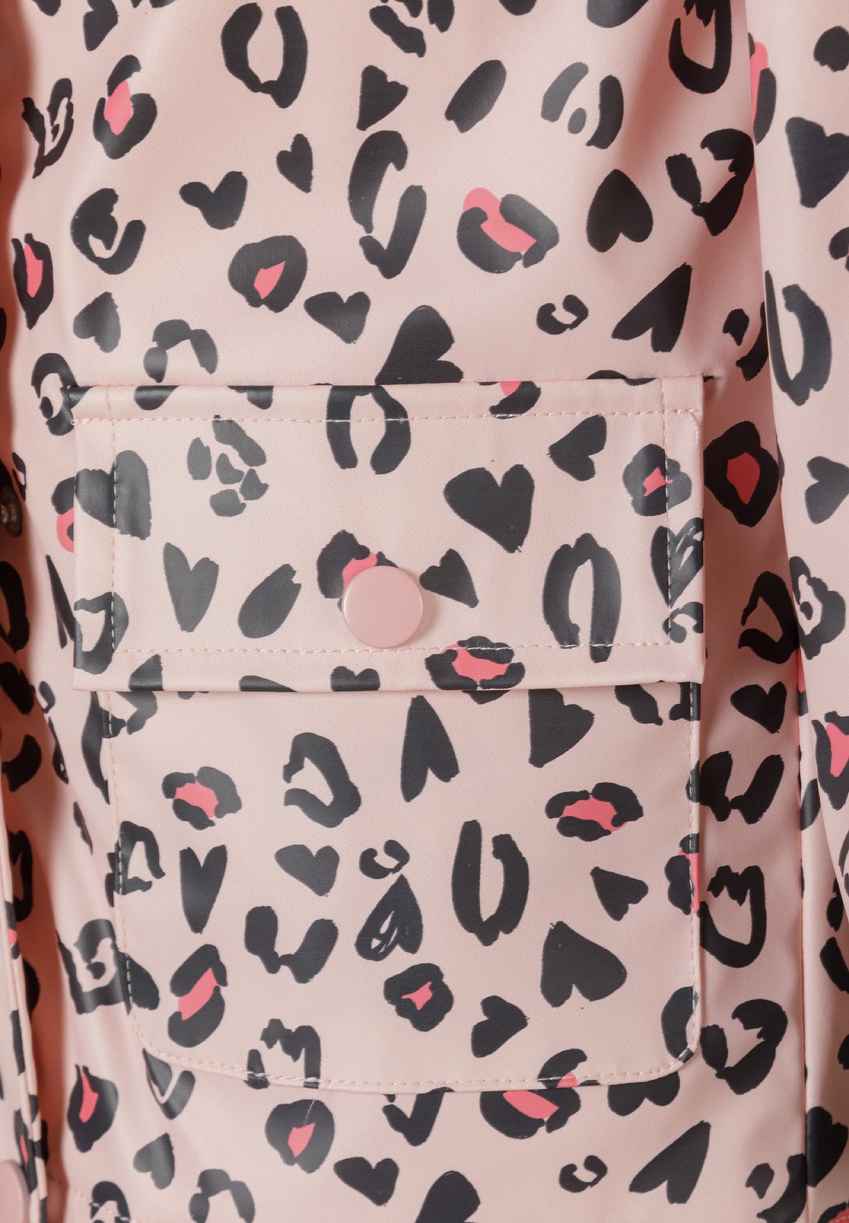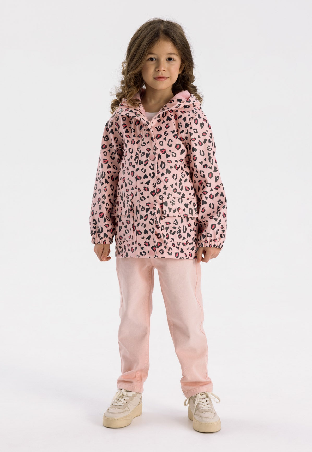 Eine Regenjacke für Mädchen, die leichten Schutz vor nassem Wetter bietet. Die Jacke ist in zartem Rosa gehalten und zeigt einen detaillierten Allover-Druck mit verschiedenen Motiven. Sie besteht aus einem Stoff, der wasserabweisend ist, um die Trägerin bei Regen trocken zu halten. Der Schnitt sorgt für eine bequeme Passform, ergänzt durch einen vorderen Reißverschluss und elastische Bündchen, die einen sicheren Verschluss gewährleisten und den Schutz vor Wind und Regen verbessern. Die Jacke verfügt über eine Kapuze, die den Kopf vor Niederschlag schützt, und ist ungefüttert für Atmungsaktivität und Tragekomfort. Geeignet für Frühling und Sommer bietet die Regenjacke wichtigen Wetterschutz bei gleichzeitig weichem und praktischem Tragegefühl für den Alltag.