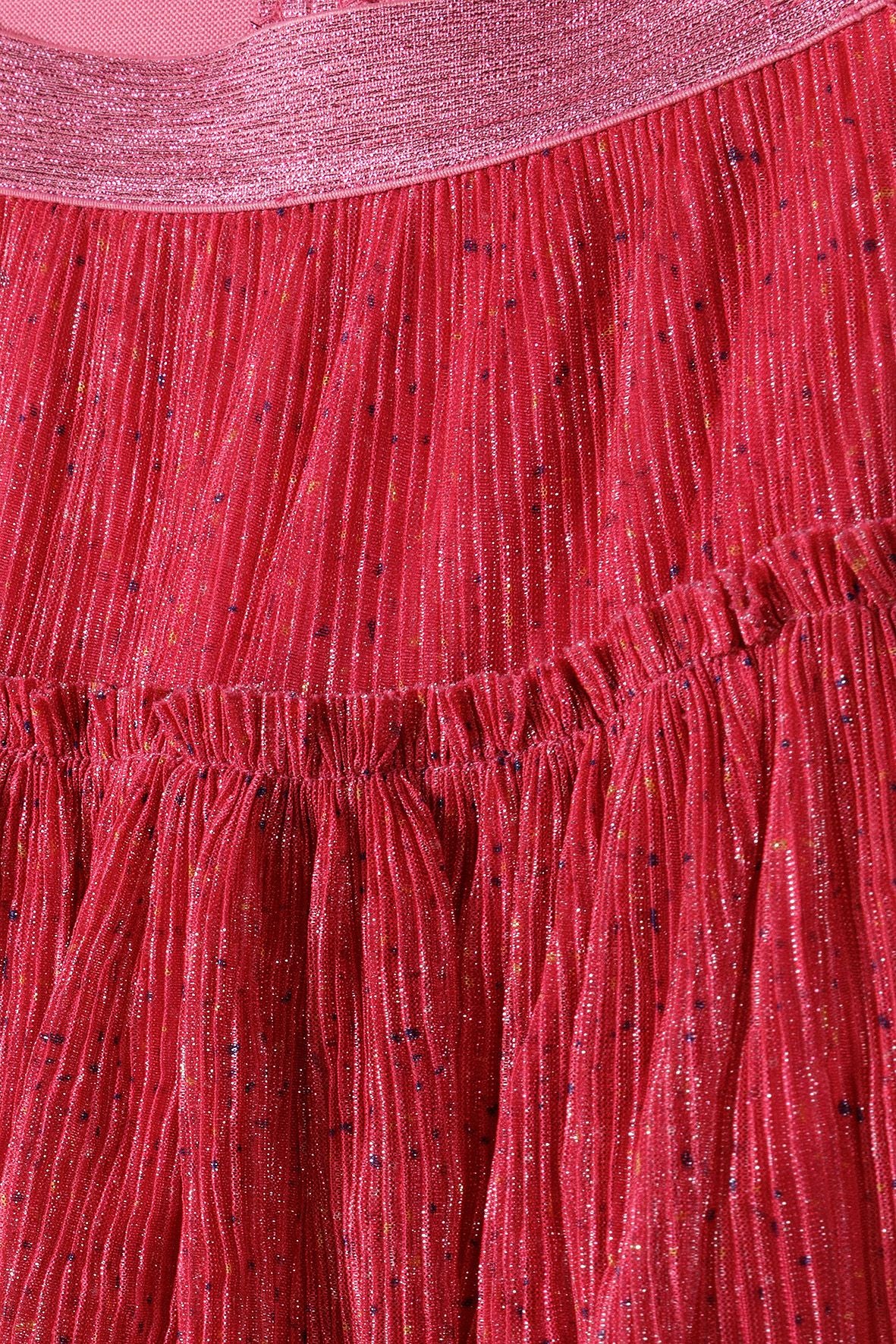 Rock für Mädchen, gedacht als festliche Kleidung, mit einem durchgehenden Glitzerdruck in Pink. Das Kleidungsstück hat einen flachen, elastischen Bund, der mit Glitzer überzogen ist und so für einen sicheren und bequemen Sitz sorgt. Die gestufte, plissierte Verarbeitung mit gerafften Abschnitten verleiht Volumen und schafft eine lebendige Silhouette. Der Rock wird zum Hineinschlüpfen getragen, was das Anziehen erleichtert. Hergestellt aus leichtem Stoff, ermöglicht er Bewegungsfreiheit und behält dabei den funkelnden Glanz während des Tragens. Der plissierte Rock enthält keine zusätzlichen strukturellen Details wie Taschen oder Bündchen und ist so gestaltet, dass er dekorative Merkmale mit praktischer Handhabung verbindet.