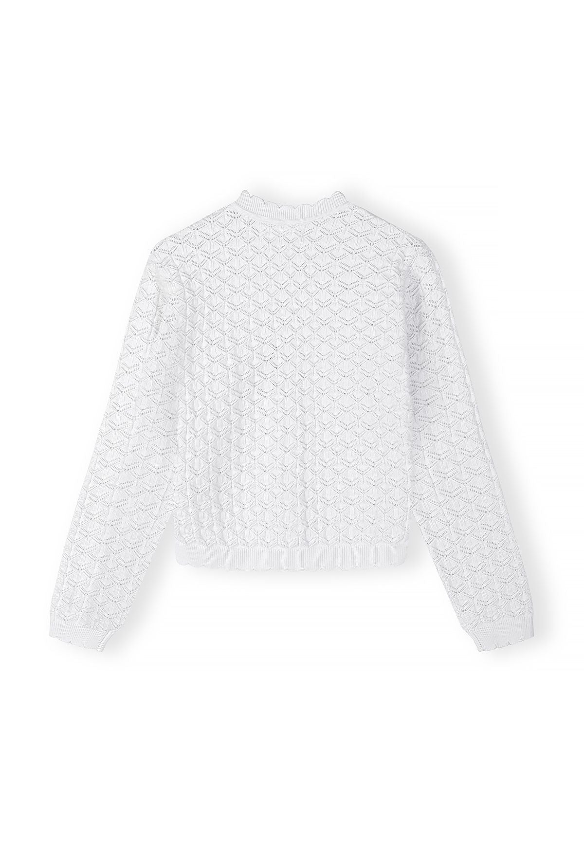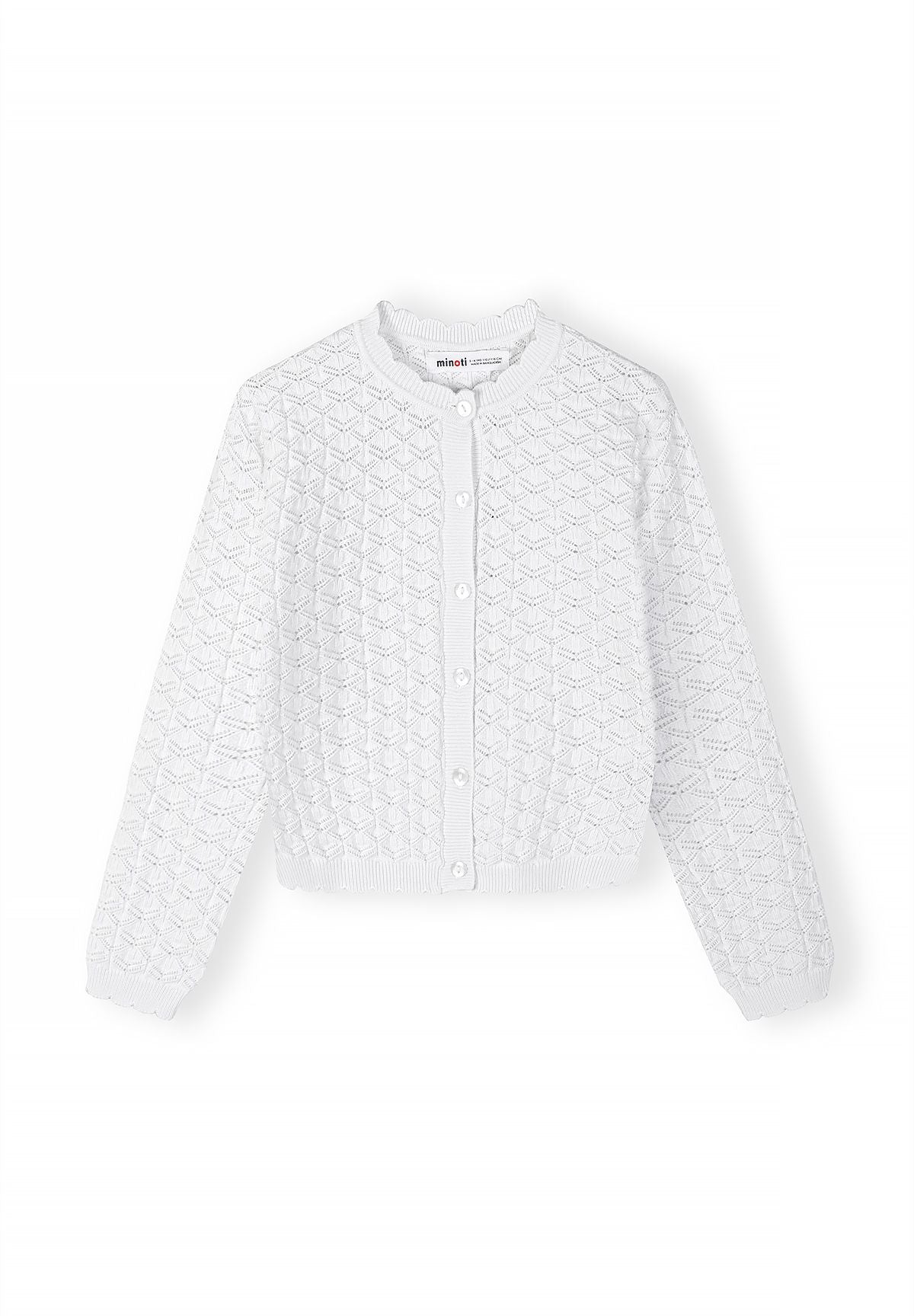 Diese elegante weiße Strickjacke verbindet klassischen Stil mit einzigartigen Details, wie wellenförmigen Abschlüssen an Saum und Bündchen, die Stil und Funktionalität perfekt ausbalancieren. Ideal für Mädchen im Alter von 3 bis 15 Jahren, gefertigt aus einer strapazierfähigen und weichen Mischung aus Viskose, Polyester und Nylon. Der atmungsaktive Stoff bietet moderate Wärme und Vielseitigkeit zum Schichten, was sie perfekt für Übergangsjahreszeiten macht und zu einem unverzichtbaren Bestandteil der Alltagsgarderobe.