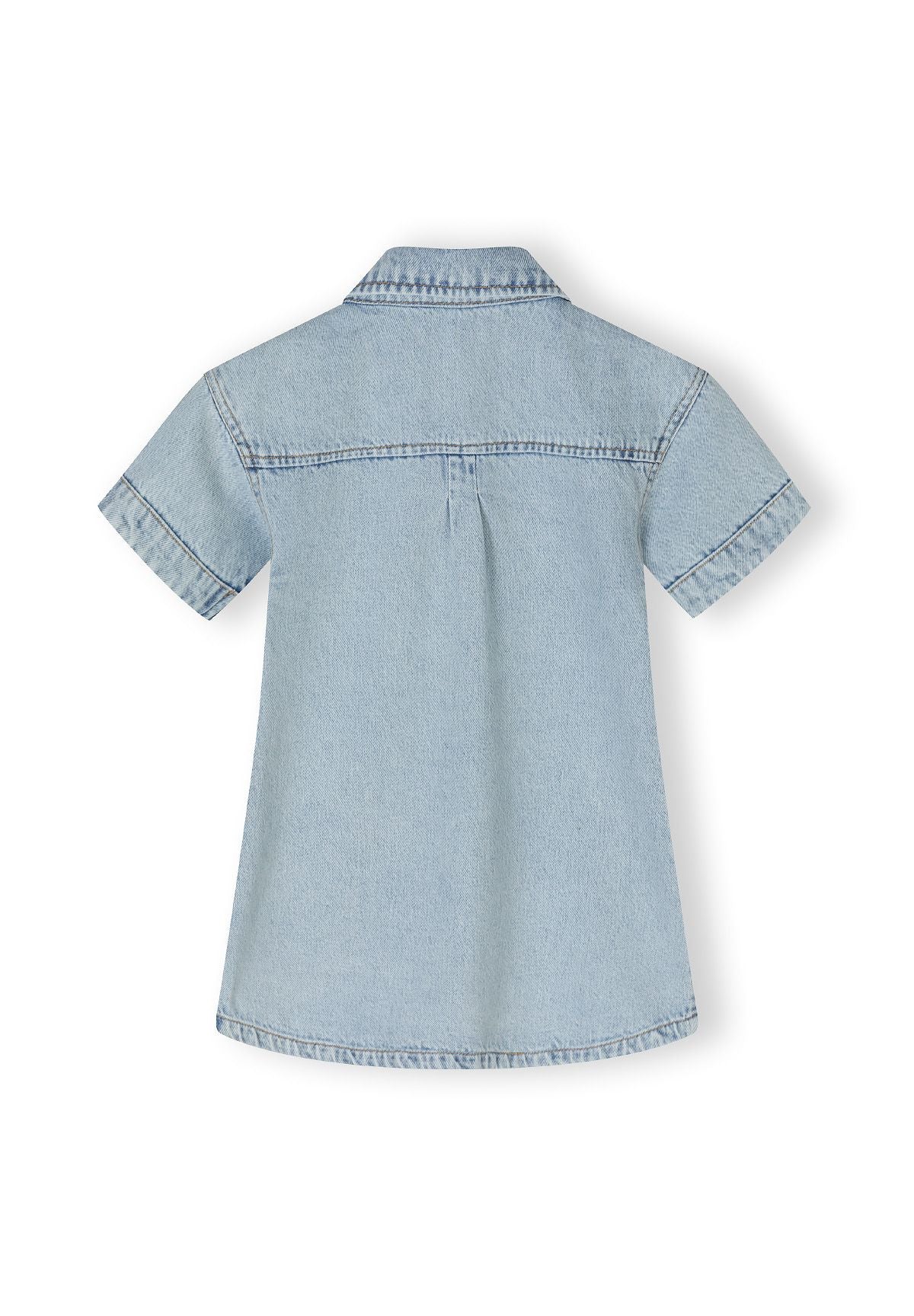 Dieses Mädchen-Kleid aus Denim mit kurzen Ärmeln und Kragen verbindet lässigen Stil mit Alltagstauglichkeit und verfügt über einen geraden Schnitt, der eine entspannte und bequeme Passform bietet. Perfekt für warme Temperaturen und die Sommersaison, präsentiert in einem frischen Hellblau mit einem klassischen Kragen, der das schlichte Design unterstreicht. Der Druckknopfverschluss vorne sorgt für einfaches An- und Ausziehen, während große aufgesetzte Taschen vorne praktischen Stauraum bieten, was es zu einem lässigen Kleidungsstück für den täglichen Gebrauch macht.