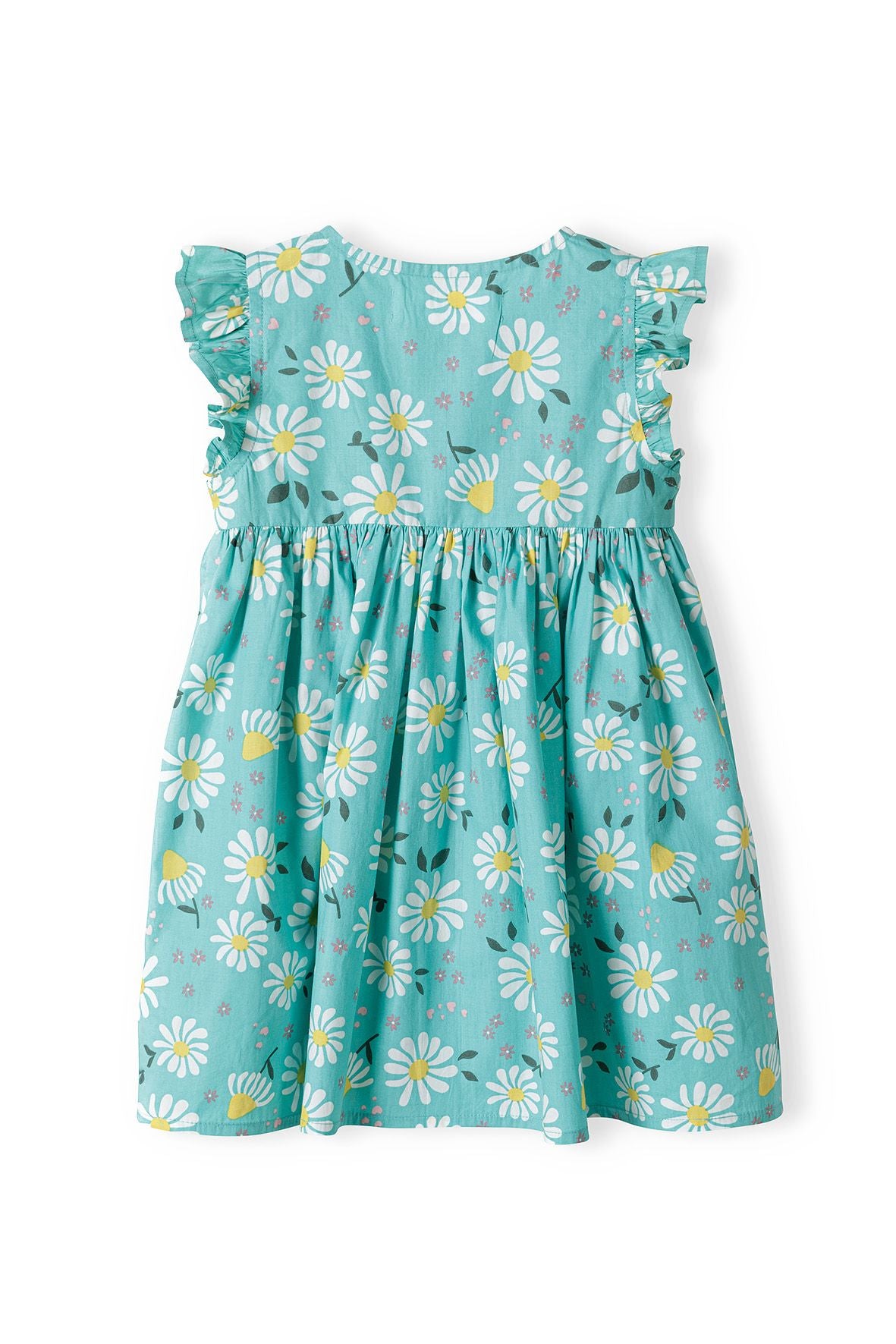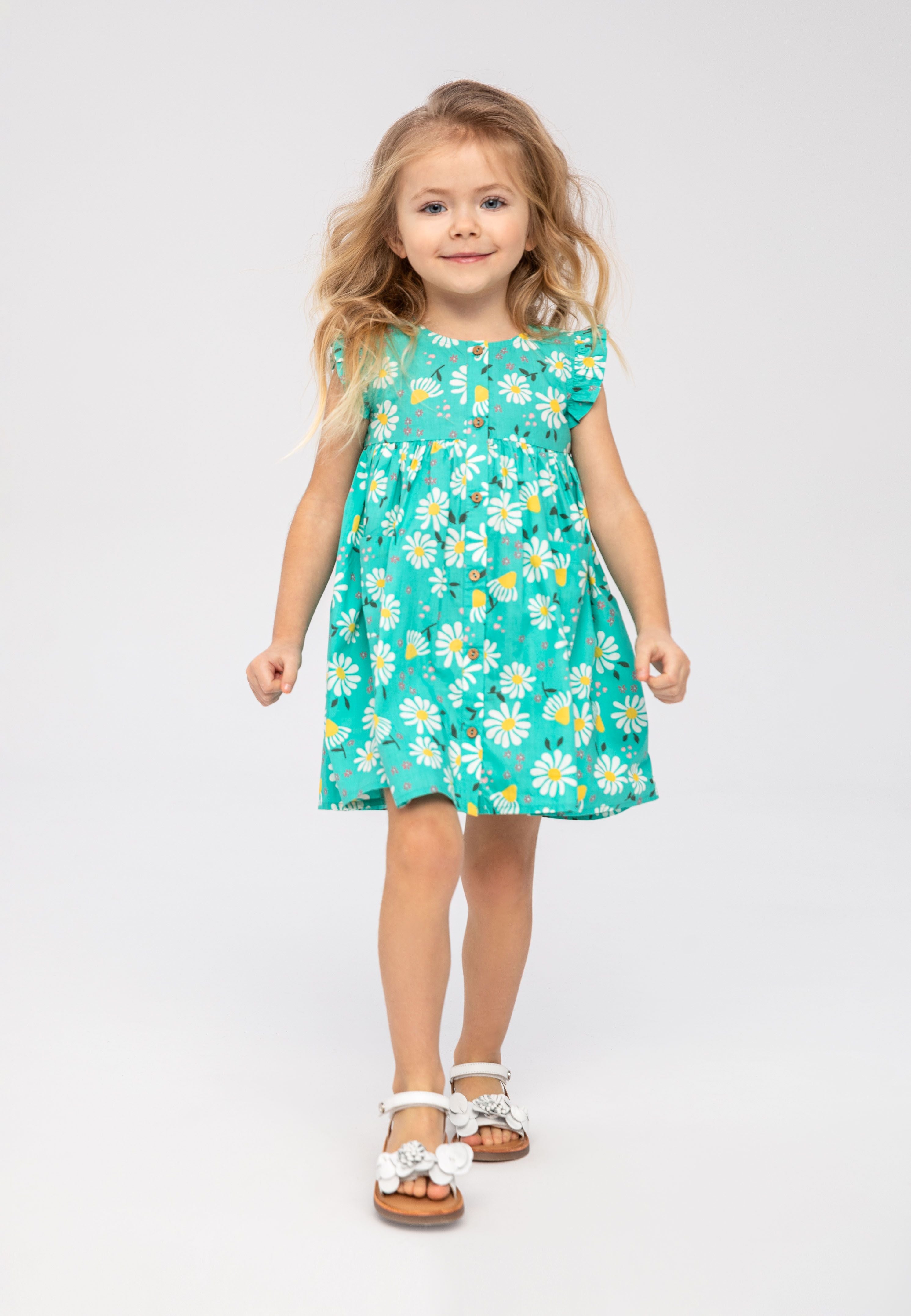 Ein Mädchenkleid, das sich für den Sommer eignet und aus einem weichen, leichten Gewebe gefertigt ist, das an warmen Tagen für angenehme Frische sorgt. Es zeigt eine grüne Grundfarbe, die durch einen durchgehenden Blumenmusterdruck ergänzt wird und so eine jahreszeitliche Optik schafft. Das Kleid verfügt über Rüschenärmel, die ein dezentes dekoratives Detail bieten und gleichzeitig den Tragekomfort bewahren. Funktionale Elemente sind praktische aufgesetzte Taschen an der unteren Vorderseite, die eine bequeme Aufbewahrung kleiner Gegenstände ermöglichen. Die Vorderseite ist mit einer durchgehenden Knopfleiste versehen, die das An- und Ausziehen erleichtert. Durch den lockeren Schnitt bietet es uneingeschränkte Bewegungsfreiheit und ist ideal für aktive Sommerbeschäftigungen. Die Kombination aus atmungsaktivem Stoff und durchdachten Details macht das Kleid zu einem vielseitigen Kleidungsstück für verschiedene Sommeranlässe.
