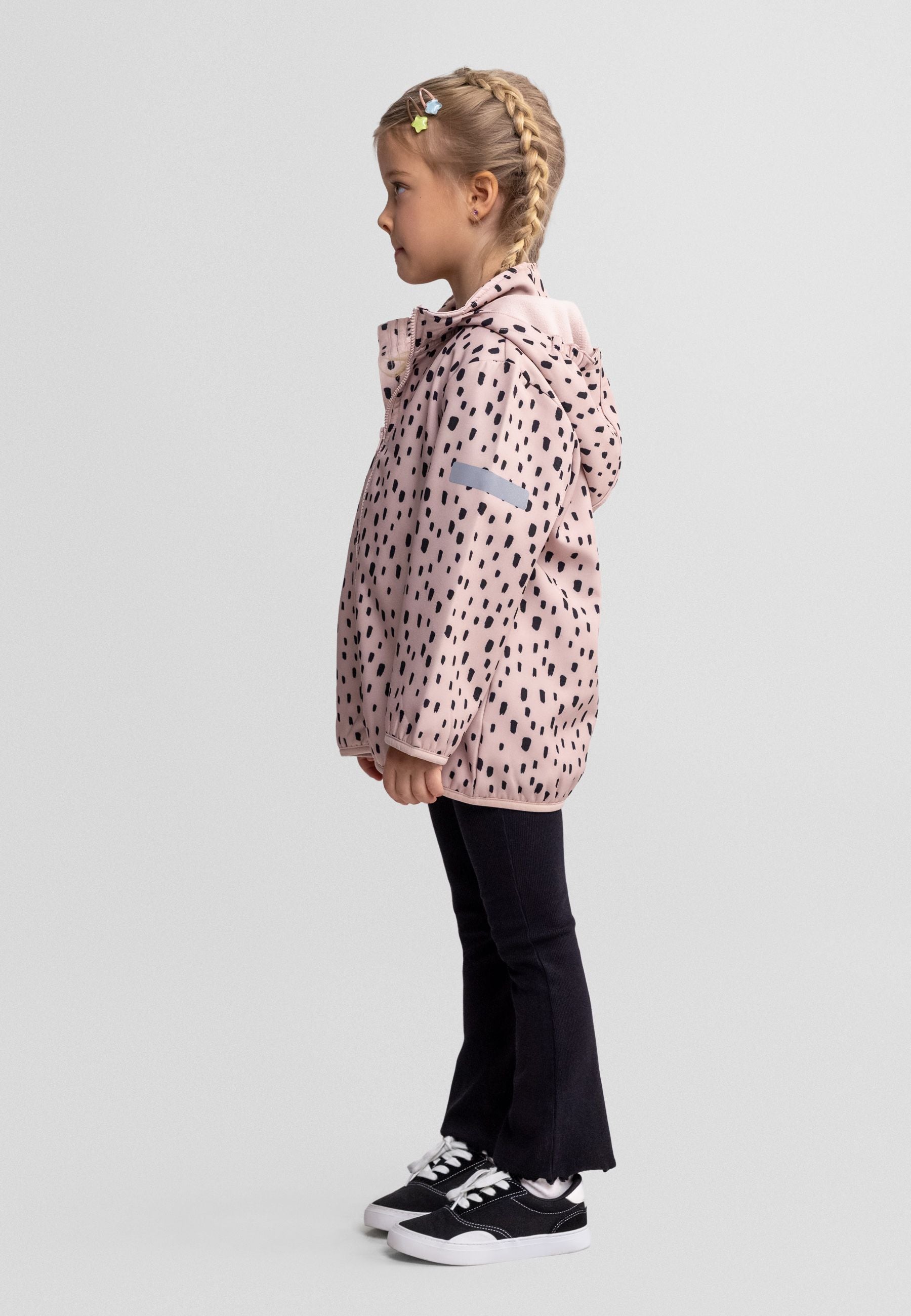Diese Softshell-Jacke für Mädchen in einem zarten Rosaton verbindet einen winddichten Außenstoff aus Polyester und Elasthan mit einer innenliegenden, verbundenen Fleece-Schicht für zusätzliche Wärme. Sie verfügt über einen durchgehenden Reißverschluss und eine abnehmbare Kapuze für vielseitiges Tragen. Die Jacke ist mit einer normalen Passform und langen Ärmeln gestaltet und bietet praktische Vordertaschen sowie elastische Bündchen, die sicheren Tragekomfort gewährleisten. Ihre robuste Verarbeitung bewahrt Form und Farbe auch nach dem Waschen, was sie zu einer verlässlichen Wahl für kühlere Tage und aktive Nutzung macht.